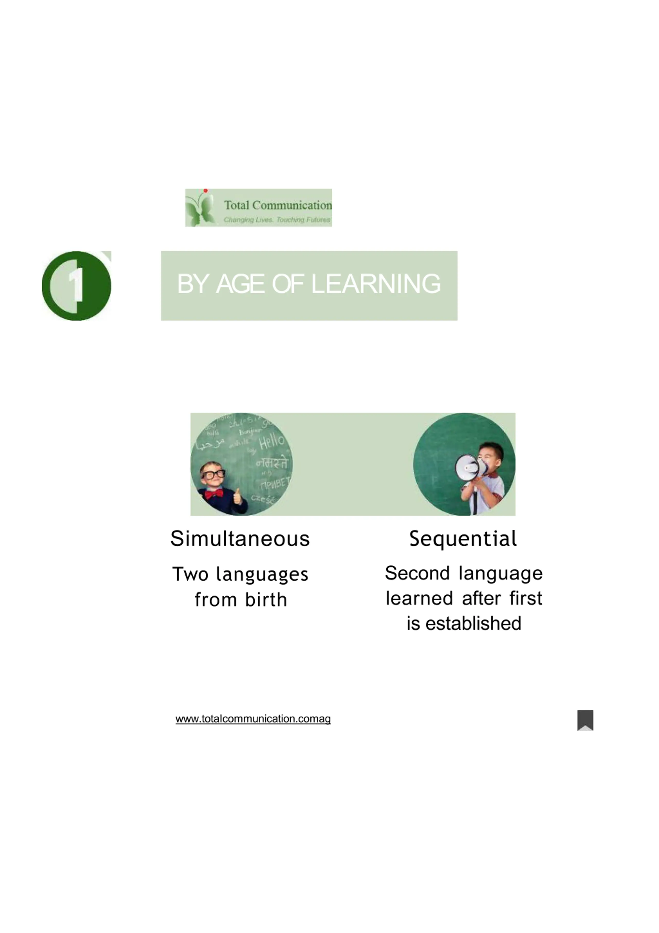 BY AGE OF LEARNING Sequential Simultaneous Second language learned after first is established Two languages from birth www.totaIcommunication.comag