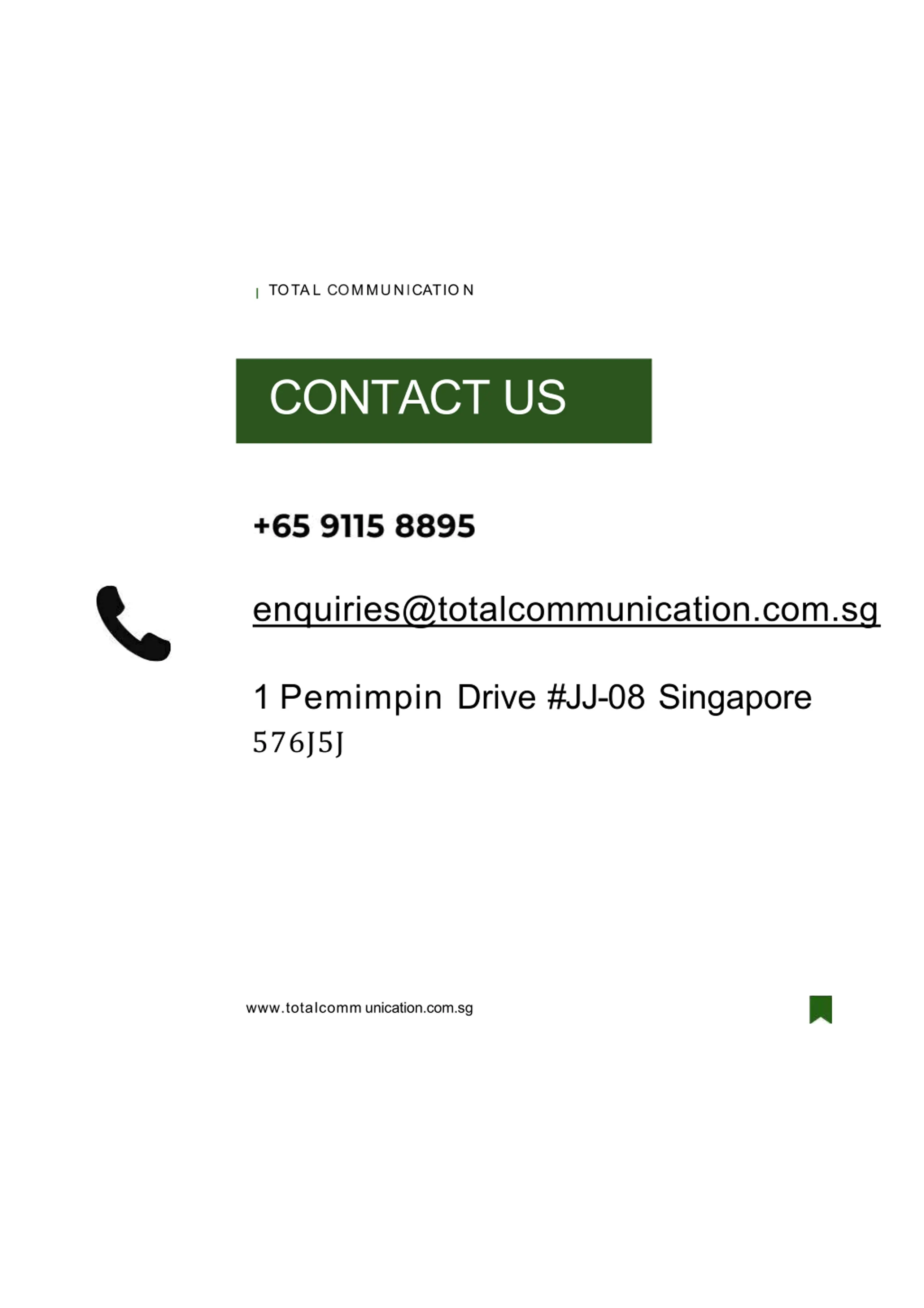 I TO TA L CO M M U N I CAT IO N CONTACT US enquiries@totalcommunication.com.sg 1 Pemimpin Drive #JJ-08 Singapore 576J5J www.totaIcomm unication.com.sg