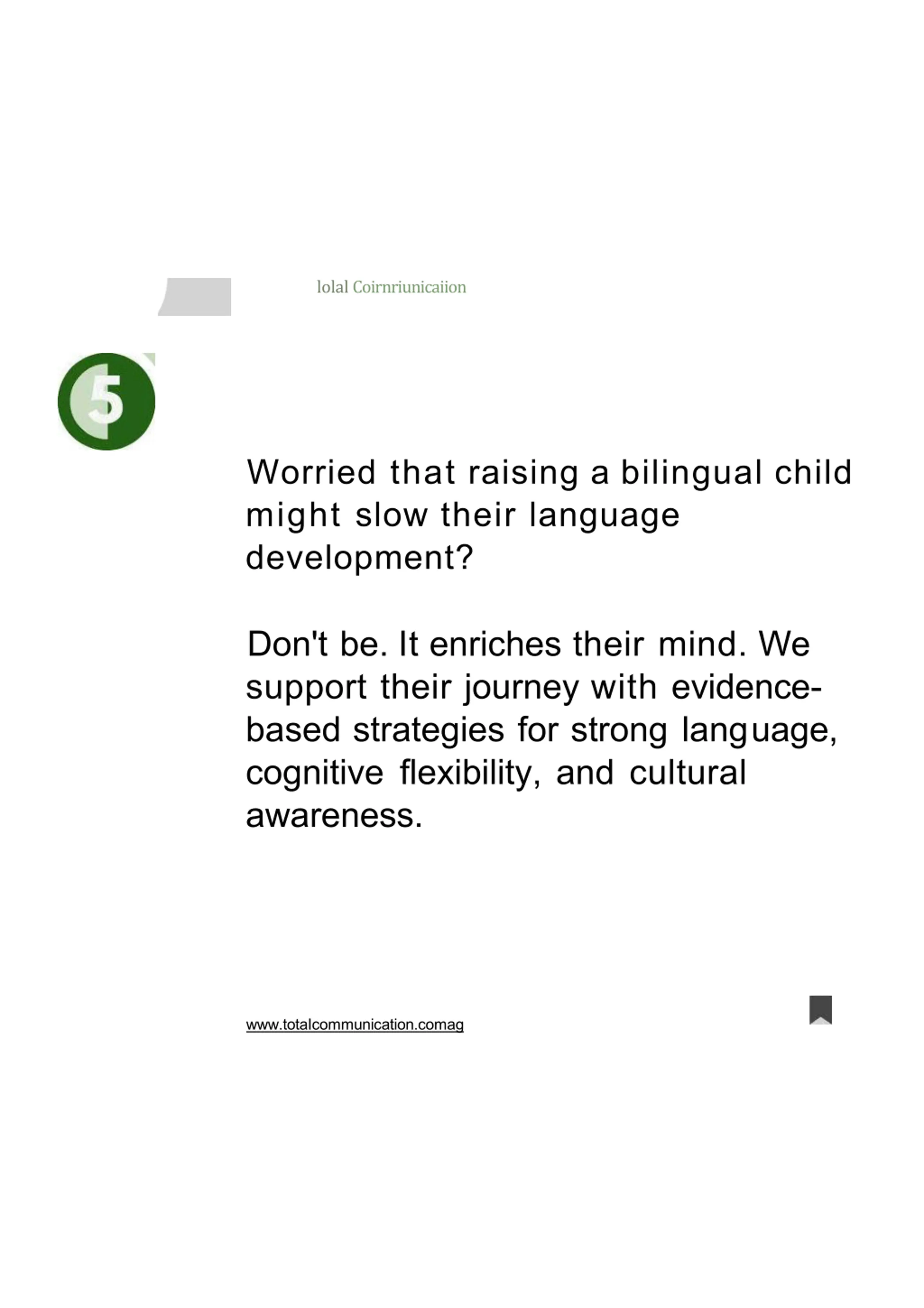 lolal Coirnriunicaiion Worried that raising a bilingual child might slow their language development? Don't be. It enriches their mind. We support their journey with evidence- based strategies for strong lang uage, cognitive flexibility, and cultural awareness. www.totaIcommunication.comag