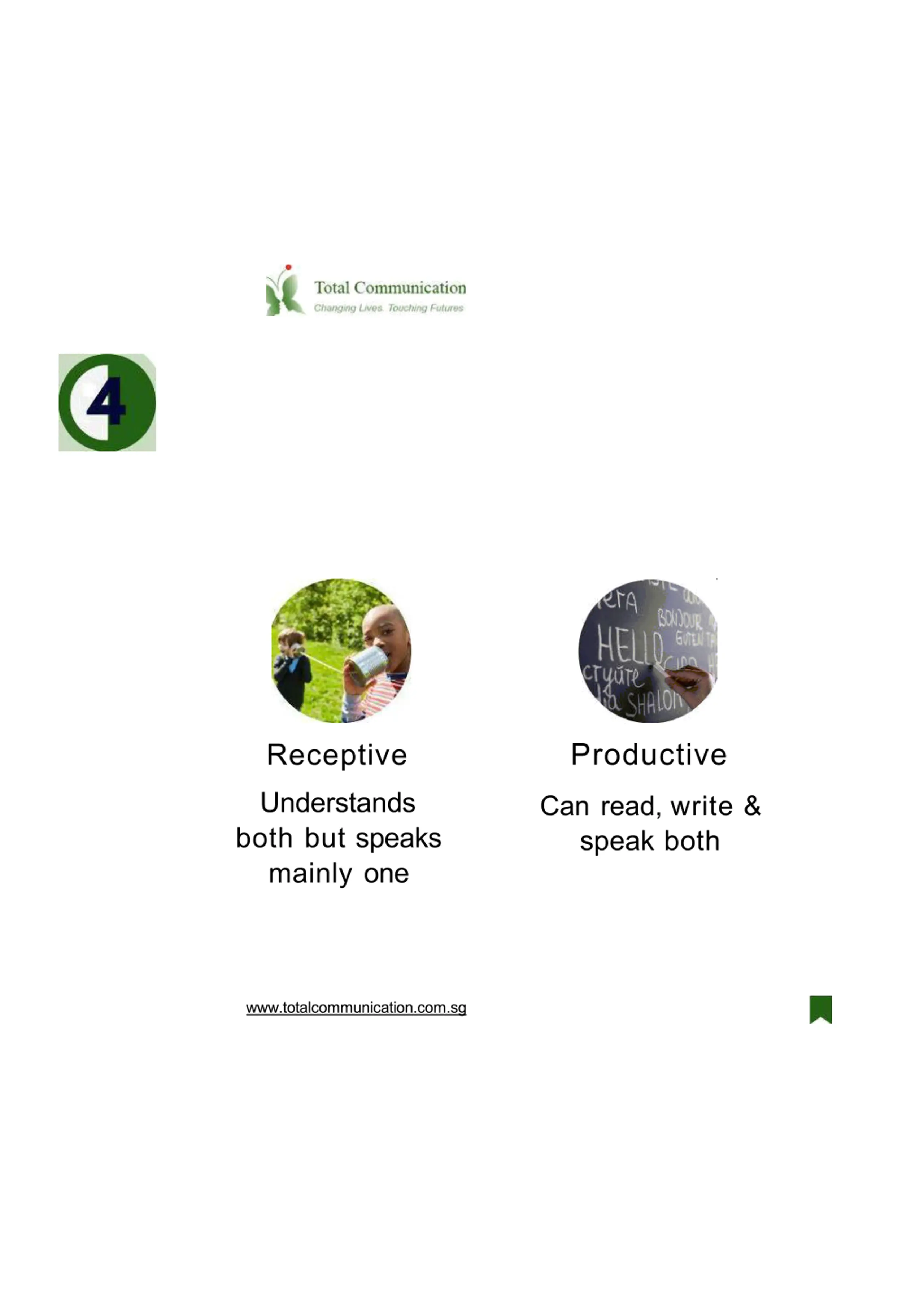 Productive Receptive Understands both but speaks mainly one Can read, write & speak both www.totalcommunication.com.sg