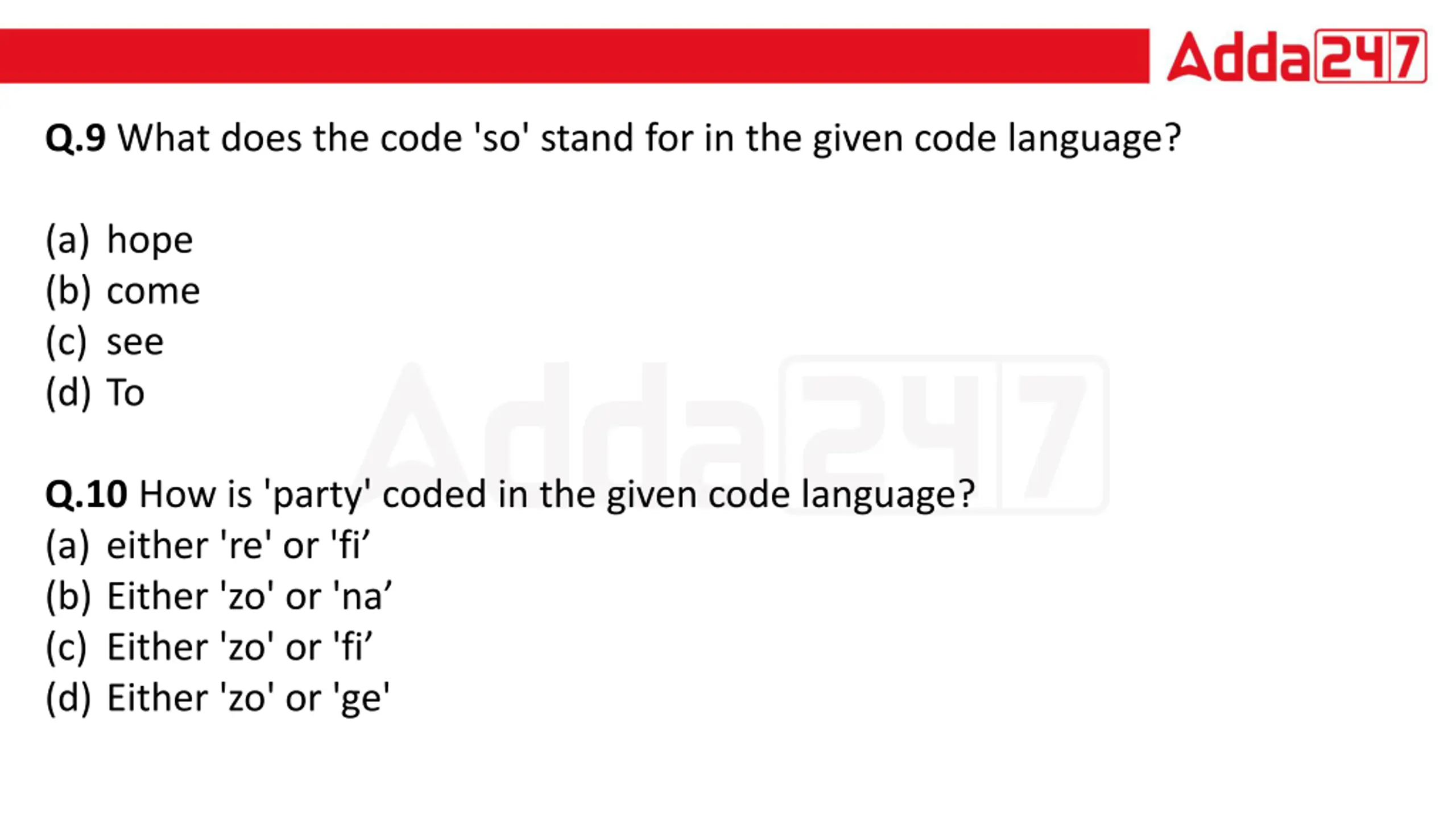 Q.9 What does the code 'so' stand for in the given code language? (a) hope (b) come (c) see (d) To Q.10 How is 'party' coded in the given code language? (a) either 're' or 'fi (b) Either 'zo' or 'na (c) Either 'zo' or 'fi (d) Either 'zo' or 'ge'