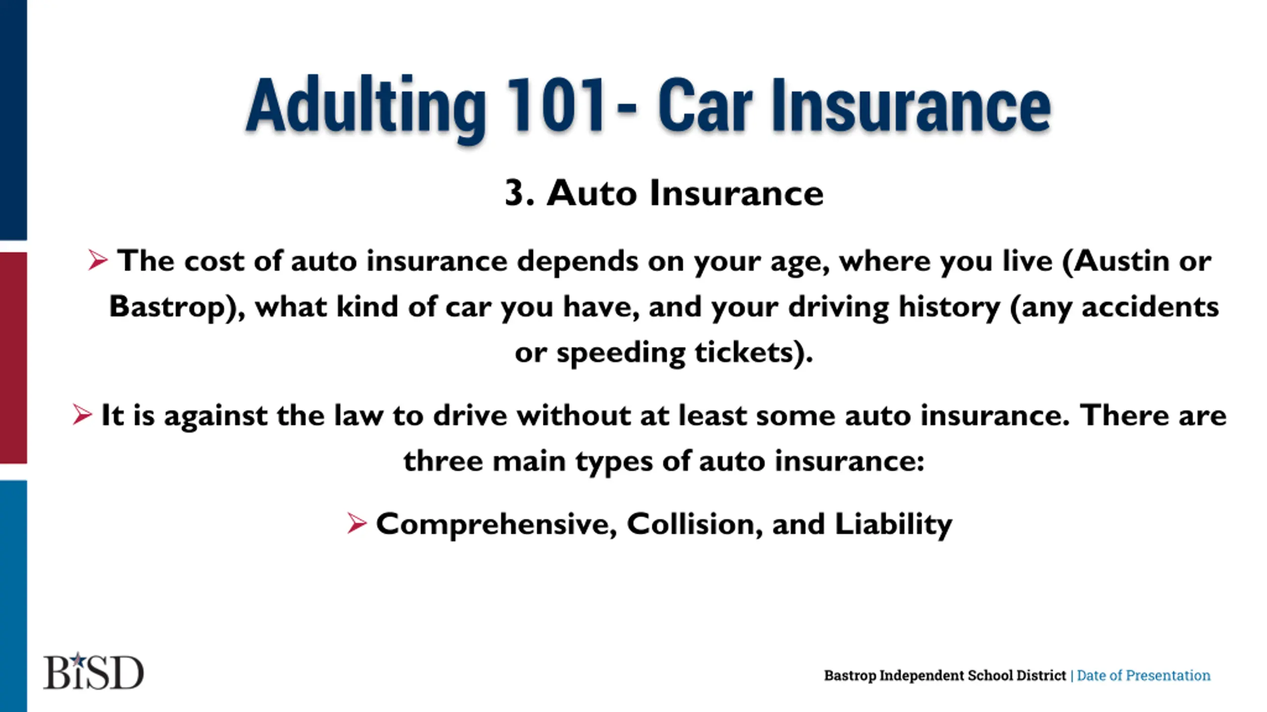 Adulting 101- Car Insurance 3. Auto Insurance The cost of auto insurance depends on your age, where you live (Austin or Bastrop), what kind of car you have, and your driving history (any accidents or speeding tickets). It is against the law to drive without at least some auto insurance. There are three main types of auto insurance: Comprehensive, Collision, and Liability Bastrop Independent School District | Date of Presentation