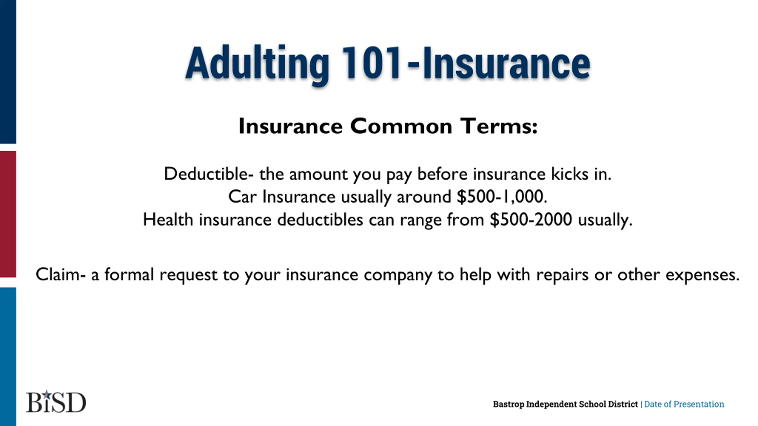 Adulting 101-Insurance Insurance Common Terms: Deductible- the amount you pay before insurance kicks in. Car Insurance usually around $500-1,000. Health insurance deductibles can range from $500-2000 usually. Claim- a formal request to your insurance company to help with repairs or other expenses. Bastrop Independent School District | Date of Presentation