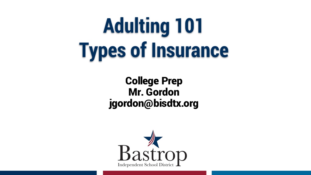 Adulting 101-Insurance There are 4 types of insurance for a college student/ young adult: 1. Health Insurance 2. Identity Theft Insurance 3. Auto Insurance 4. Renter s Insurance Bastrop Independent School District | Date of Presentation