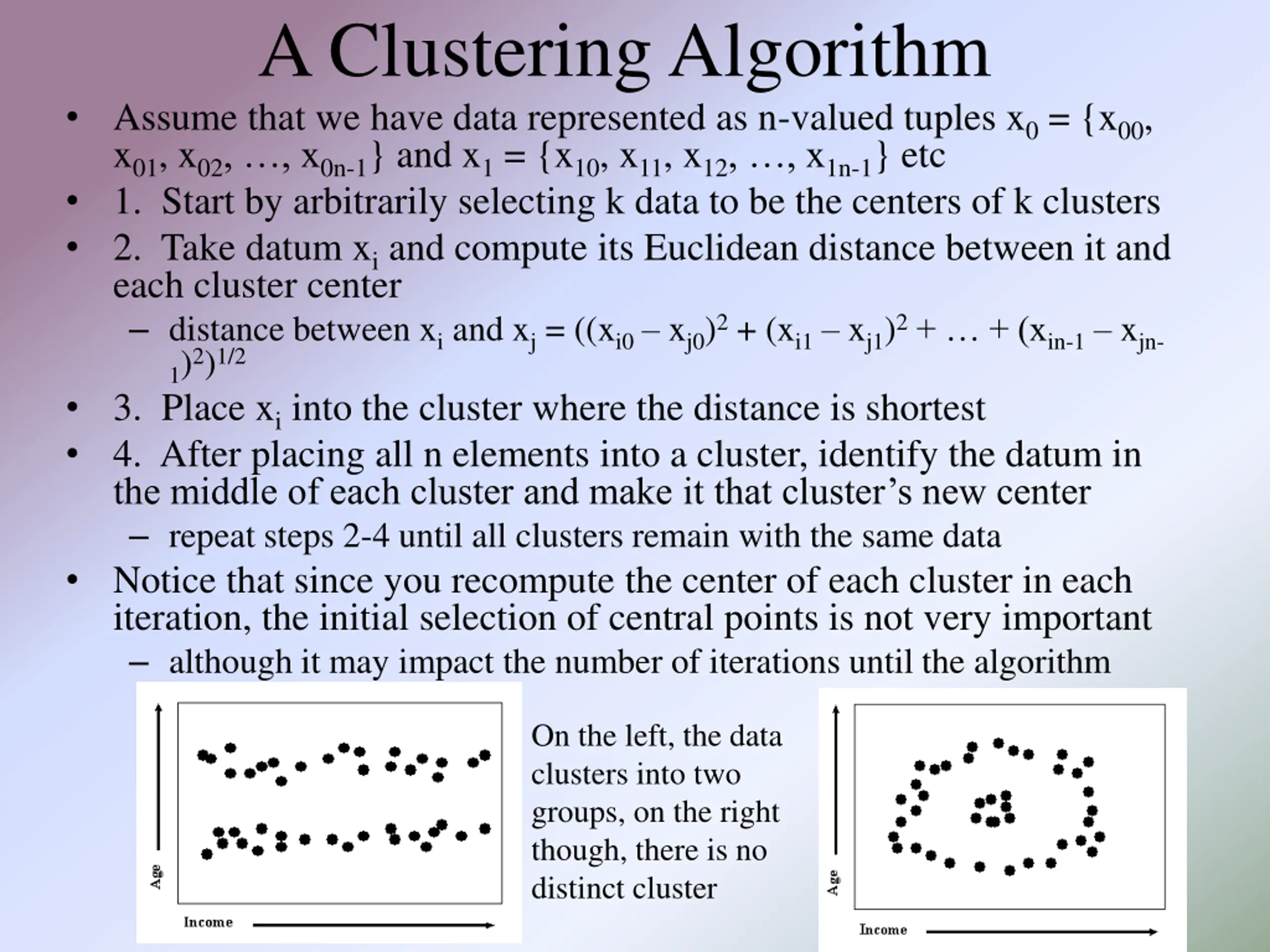 A Clustering Algorithm Assume that we have data represented as n-valued tuples x0 = {x00, x01, x02, , x0n-1} and x1 = {x10, x11, x12, , x1n-1} etc 1. Start by arbitrarily selecting k data to be the centers of k clusters 2. Take datum xi and compute its Euclidean distance between it and each cluster center distance between xi and xj = ((xi0 xj0)2 + (xi1 xj1)2+ + (xin-1 xjn- 1)2)1/2 3. Place xi into the cluster where the distance is shortest 4. After placing all n elements into a cluster, identify the datum in the middle of each cluster and make it that cluster s new center repeat steps 2-4 until all clusters remain with the same data Notice that since you recompute the center of each cluster in each iteration, the initial selection of central points is not very important although it may impact the number of iterations until the algorithm converges On the left, the data clusters into two groups, on the right though, there is no distinct cluster