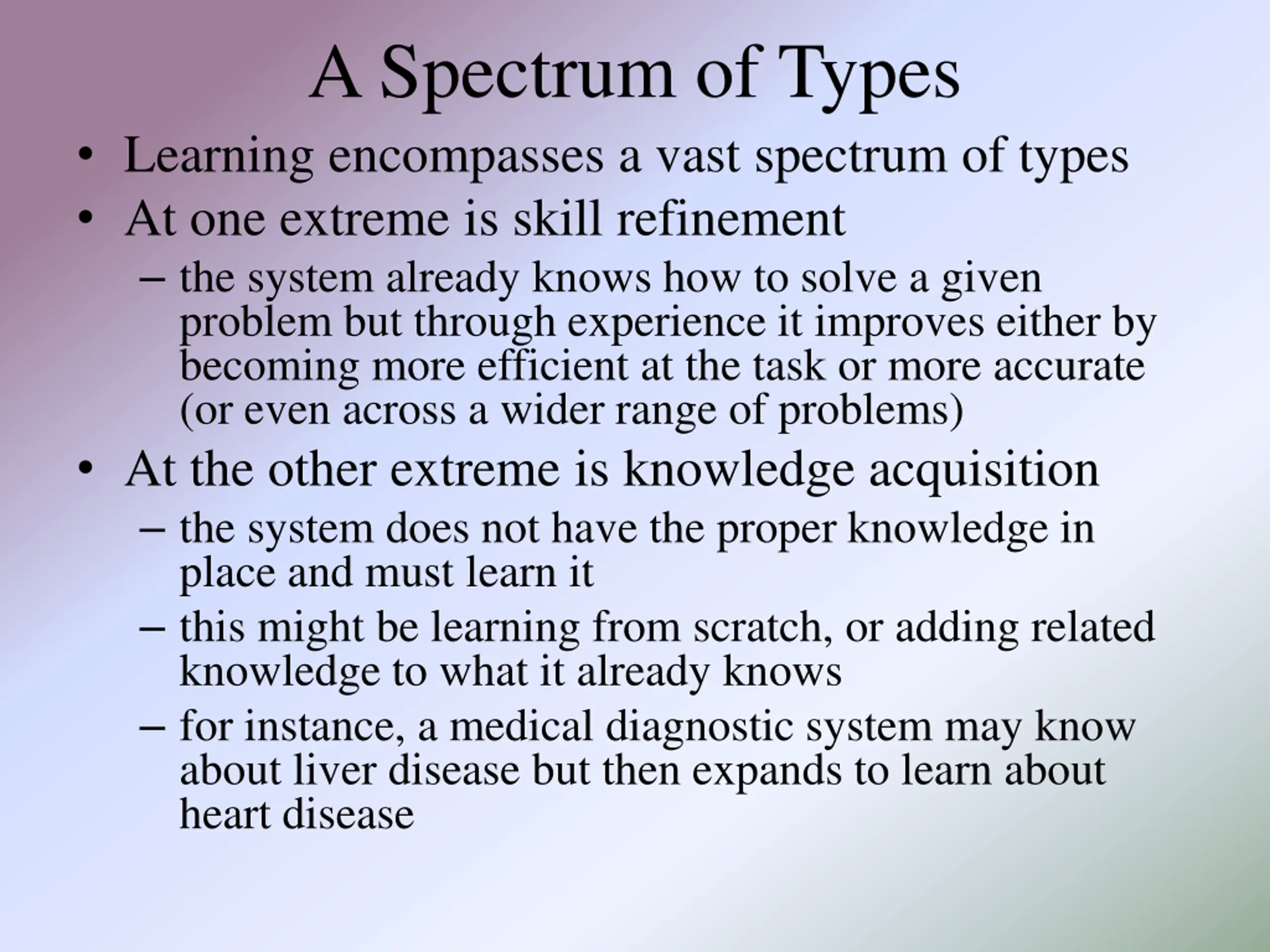 A Spectrum of Types Learning encompasses a vast spectrum of types At one extreme is skill refinement the system already knows how to solve a given problem but through experience it improves either by becoming more efficient at the task or more accurate (or even across a wider range of problems) At the other extreme is knowledge acquisition the system does not have the proper knowledge in place and must learn it this might be learning from scratch, or adding related knowledge to what it already knows for instance, a medical diagnostic system may know about liver disease but then expands to learn about heart disease