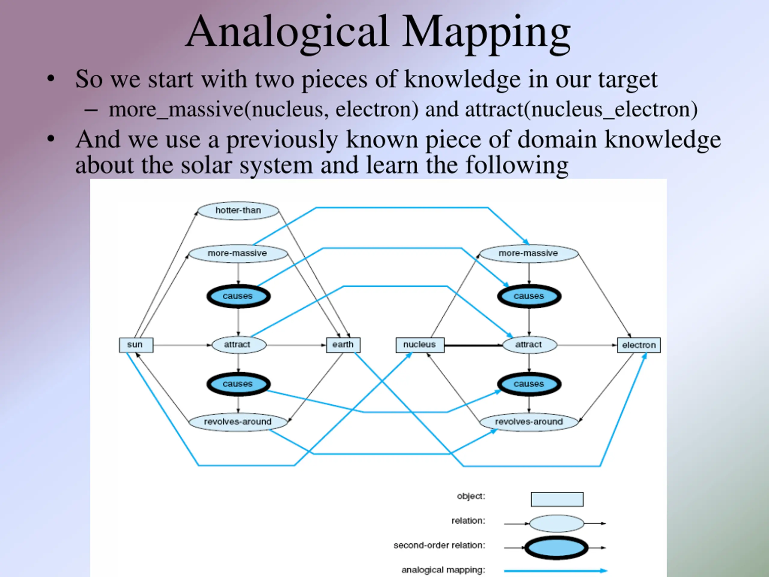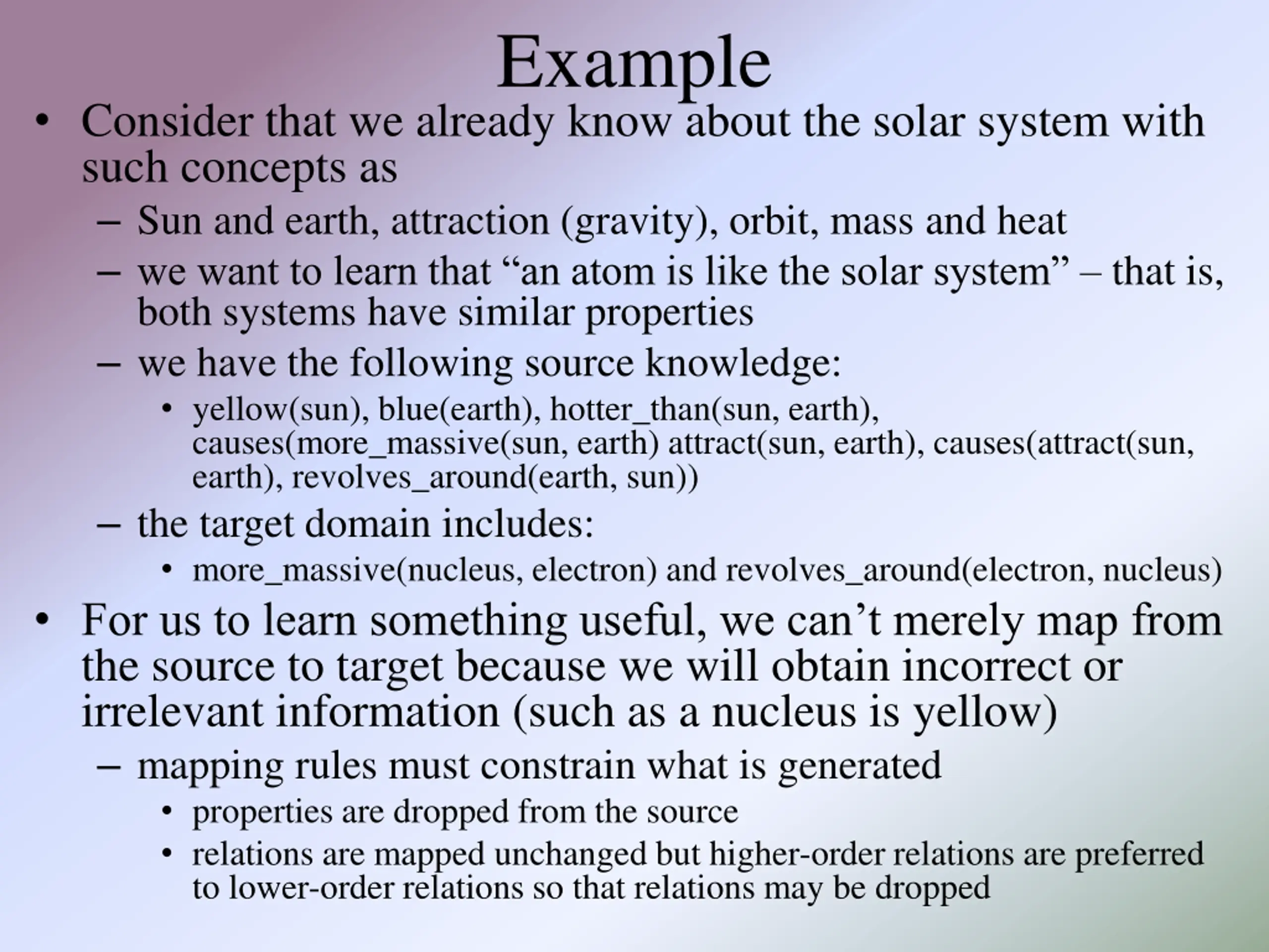 Example Consider that we already know about the solar system with such concepts as Sun and earth, attraction (gravity), orbit, mass and heat we want to learn that an atom is like the solar system that is, both systems have similar properties we have the following source knowledge: yellow(sun), blue(earth), hotter_than(sun, earth), causes(more_massive(sun, earth) attract(sun, earth), causes(attract(sun, earth), revolves_around(earth, sun)) the target domain includes: more_massive(nucleus, electron) and revolves_around(electron, nucleus) For us to learn something useful, we can t merely map from the source to target because we will obtain incorrect or irrelevant information (such as a nucleus is yellow) mapping rules must constrain what is generated properties are dropped from the source relations are mapped unchanged but higher-order relations are preferred to lower-order relations so that relations may be dropped