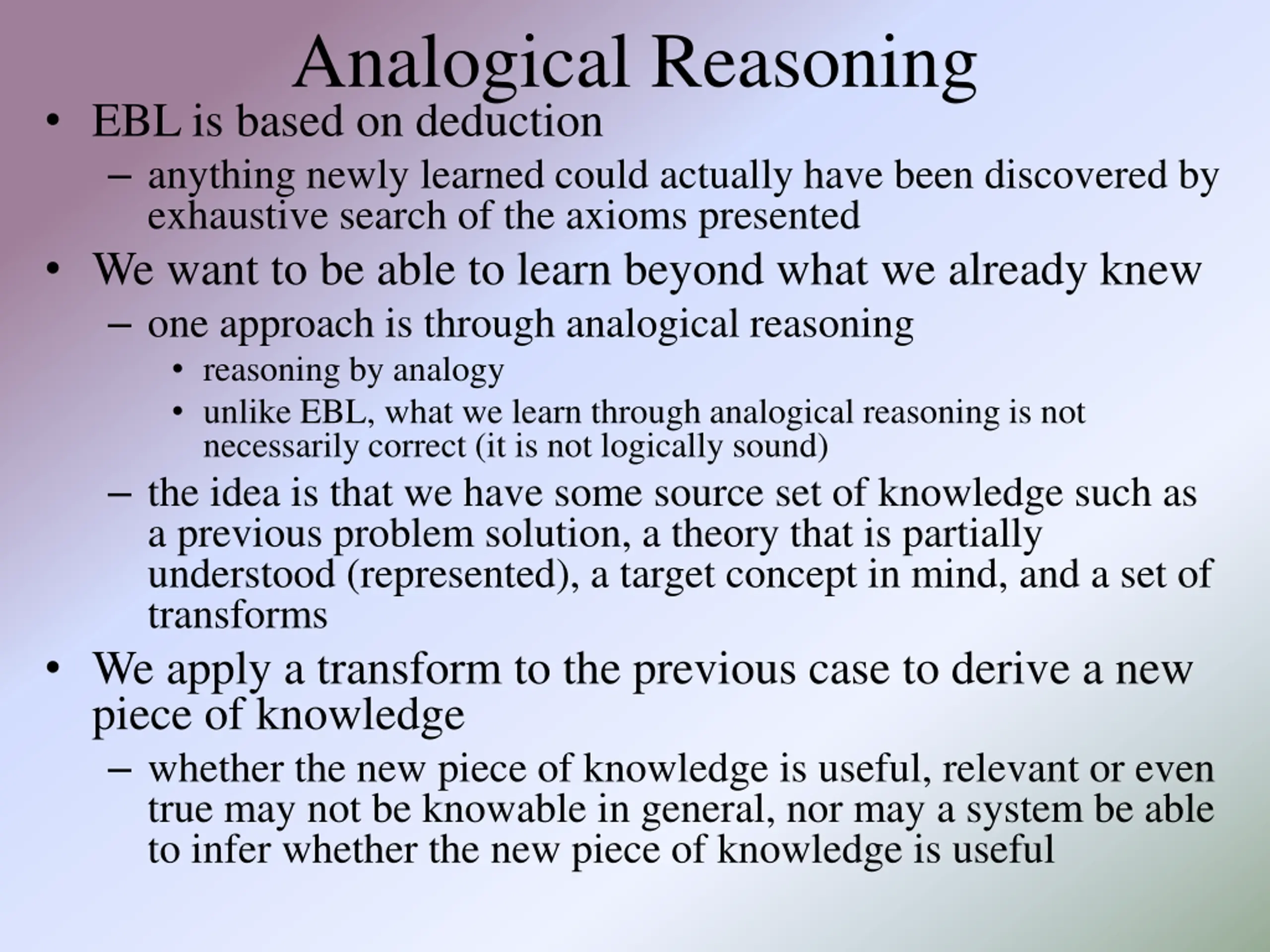 Analogical Reasoning EBL is based on deduction anything newly learned could actually have been discovered by exhaustive search of the axioms presented We want to be able to learn beyond what we already knew one approach is through analogical reasoning reasoning by analogy unlike EBL, what we learn through analogical reasoning is not necessarily correct (it is not logically sound) the idea is that we have some source set of knowledge such as a previous problem solution, a theory that is partially understood (represented), a target concept in mind, and a set of transforms We apply a transform to the previous case to derive a new piece of knowledge whether the new piece of knowledge is useful, relevant or even true may not be knowable in general, nor may a system be able to infer whether the new piece of knowledge is useful