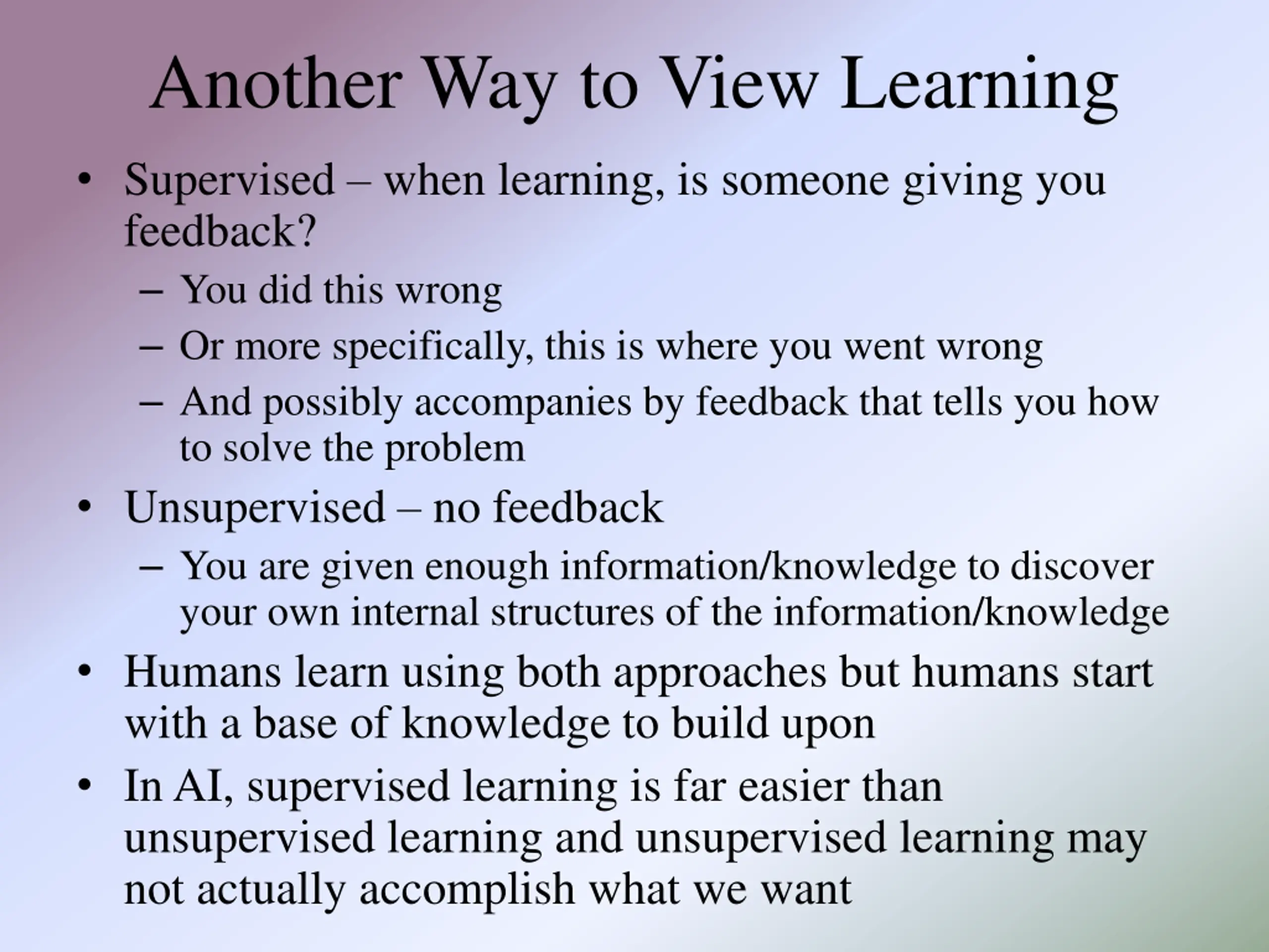 Another Way to View Learning Supervised when learning, is someone giving you feedback? You did this wrong Or more specifically, this is where you went wrong And possibly accompanies by feedback that tells you how to solve the problem Unsupervised no feedback You are given enough information/knowledge to discover your own internal structures of the information/knowledge Humans learn using both approaches but humans start with a base of knowledge to build upon In AI, supervised learning is far easier than unsupervised learning and unsupervised learning may not actually accomplish what we want