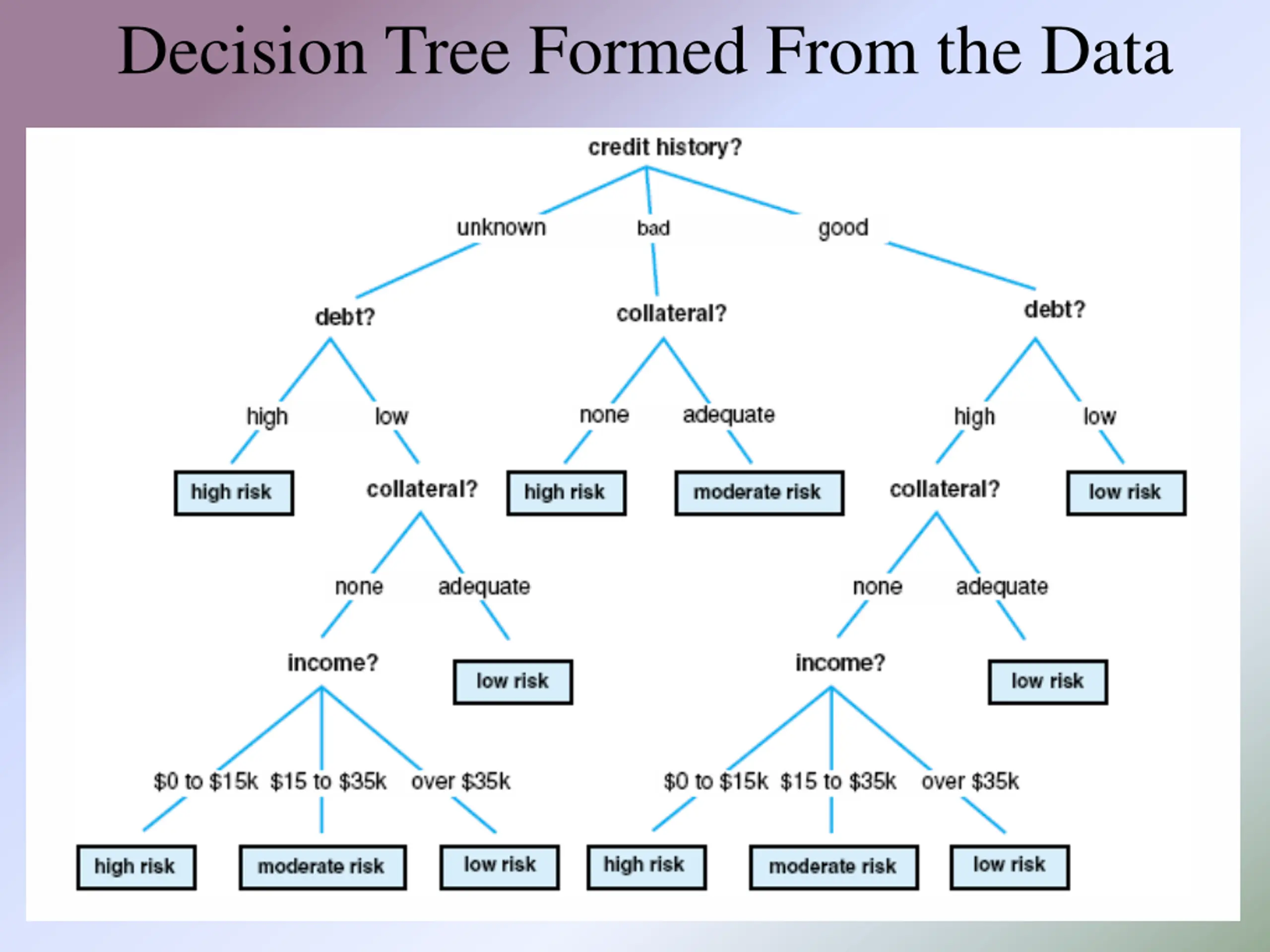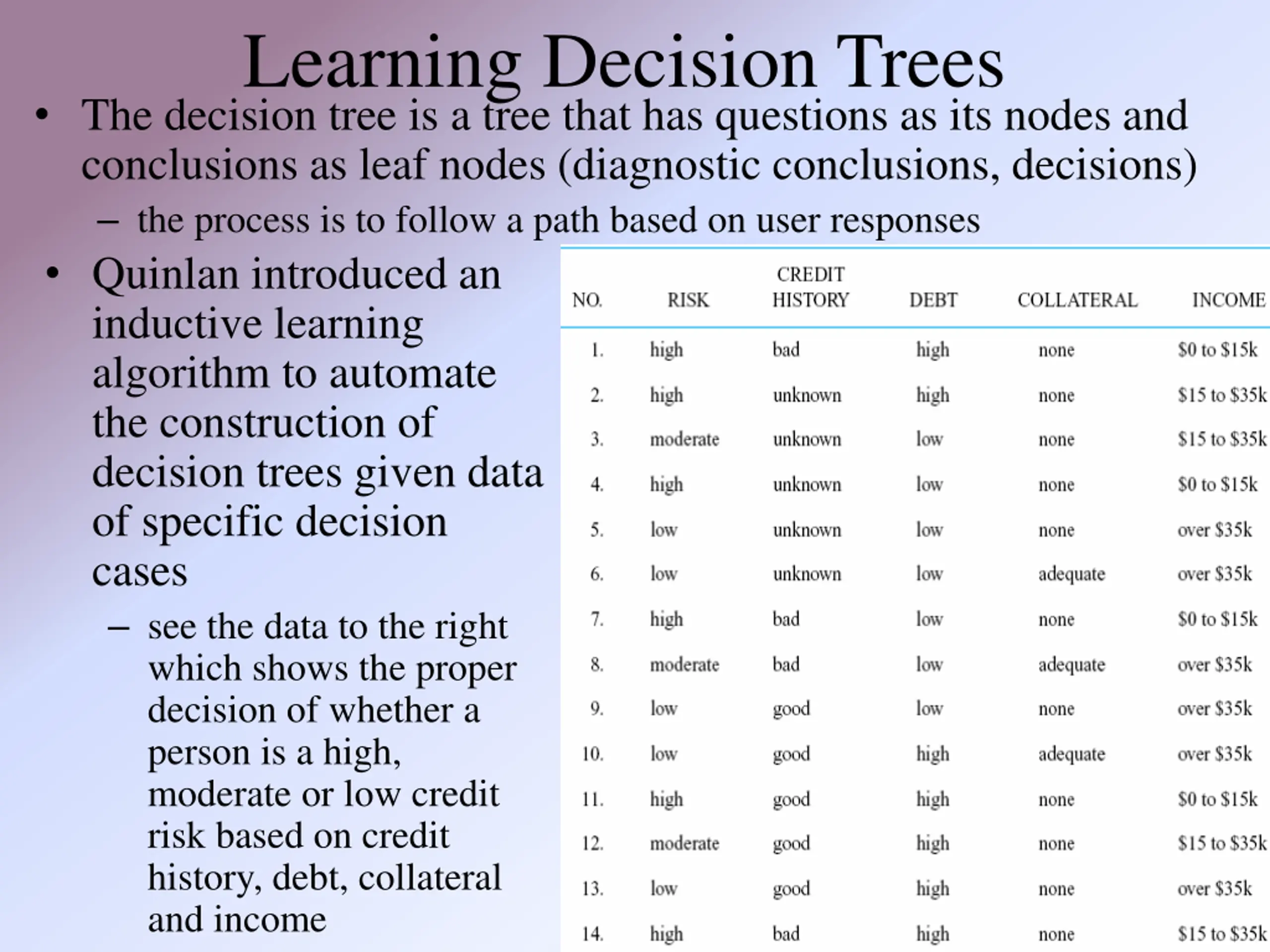 Learning Decision Trees The decision tree is a tree that has questions as its nodes and conclusions as leaf nodes (diagnostic conclusions, decisions) the process is to follow a path based on user responses Quinlan introduced an inductive learning algorithm to automate the construction of decision trees given data of specific decision cases see the data to the right which shows the proper decision of whether a person is a high, moderate or low credit risk based on credit history, debt, collateral and income