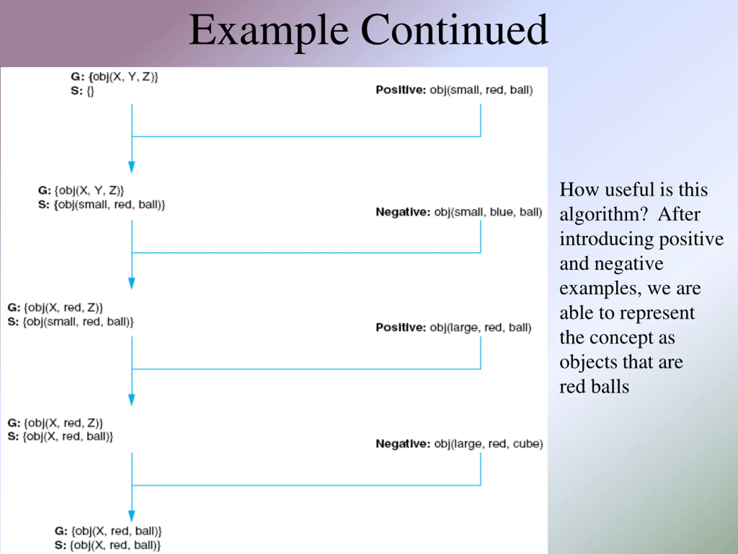 Example Continued How useful is this algorithm? After introducing positive and negative examples, we are able to represent the concept as objects that are red balls