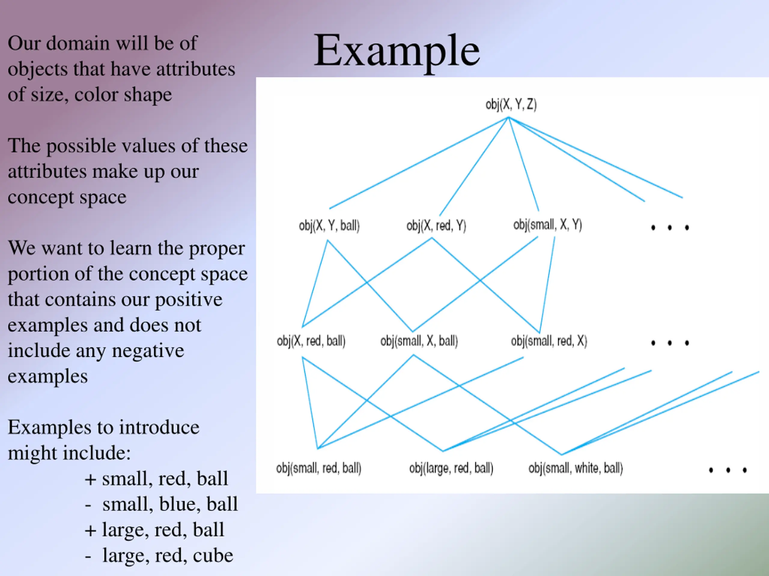Example Our domain will be of objects that have attributes of size, color shape The possible values of these attributes make up our concept space We want to learn the proper portion of the concept space that contains our positive examples and does not include any negative examples Examples to introduce might include: + small, red, ball - small, blue, ball + large, red, ball - large, red, cube