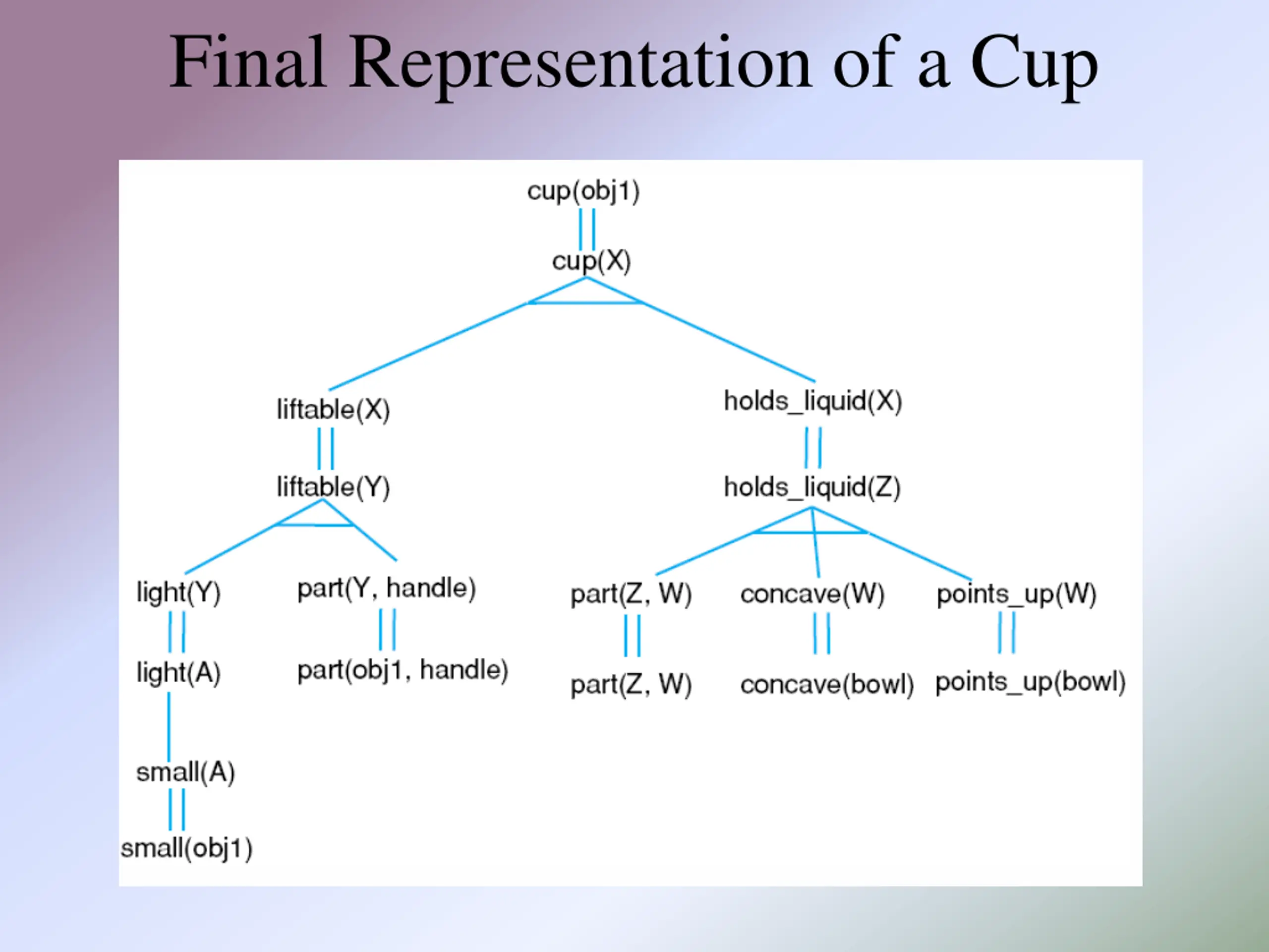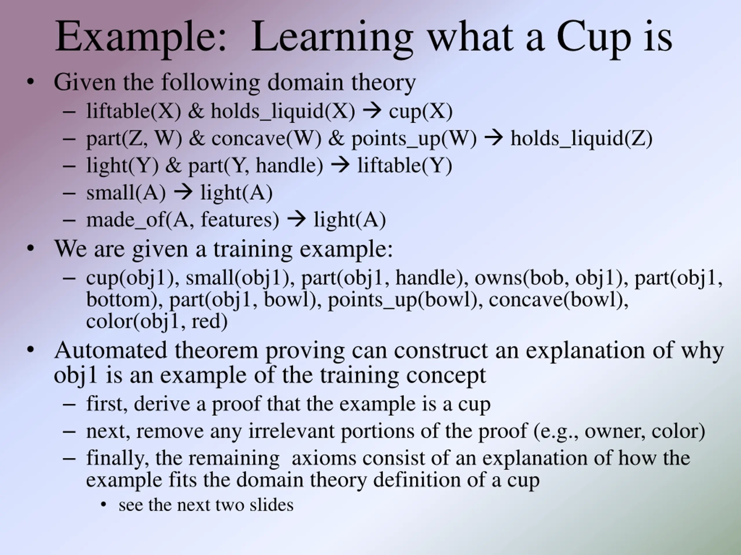 Example: Learning what a Cup is Given the following domain theory liftable(X) & holds_liquid(X) cup(X) part(Z, W) & concave(W) & points_up(W) holds_liquid(Z) light(Y) & part(Y, handle) liftable(Y) small(A) light(A) made_of(A, features) light(A) We are given a training example: cup(obj1), small(obj1), part(obj1, handle), owns(bob, obj1), part(obj1, bottom), part(obj1, bowl), points_up(bowl), concave(bowl), color(obj1, red) Automated theorem proving can construct an explanation of why obj1 is an example of the training concept first, derive a proof that the example is a cup next, remove any irrelevant portions of the proof (e.g., owner, color) finally, the remaining axioms consist of an explanation of how the example fits the domain theory definition of a cup see the next two slides