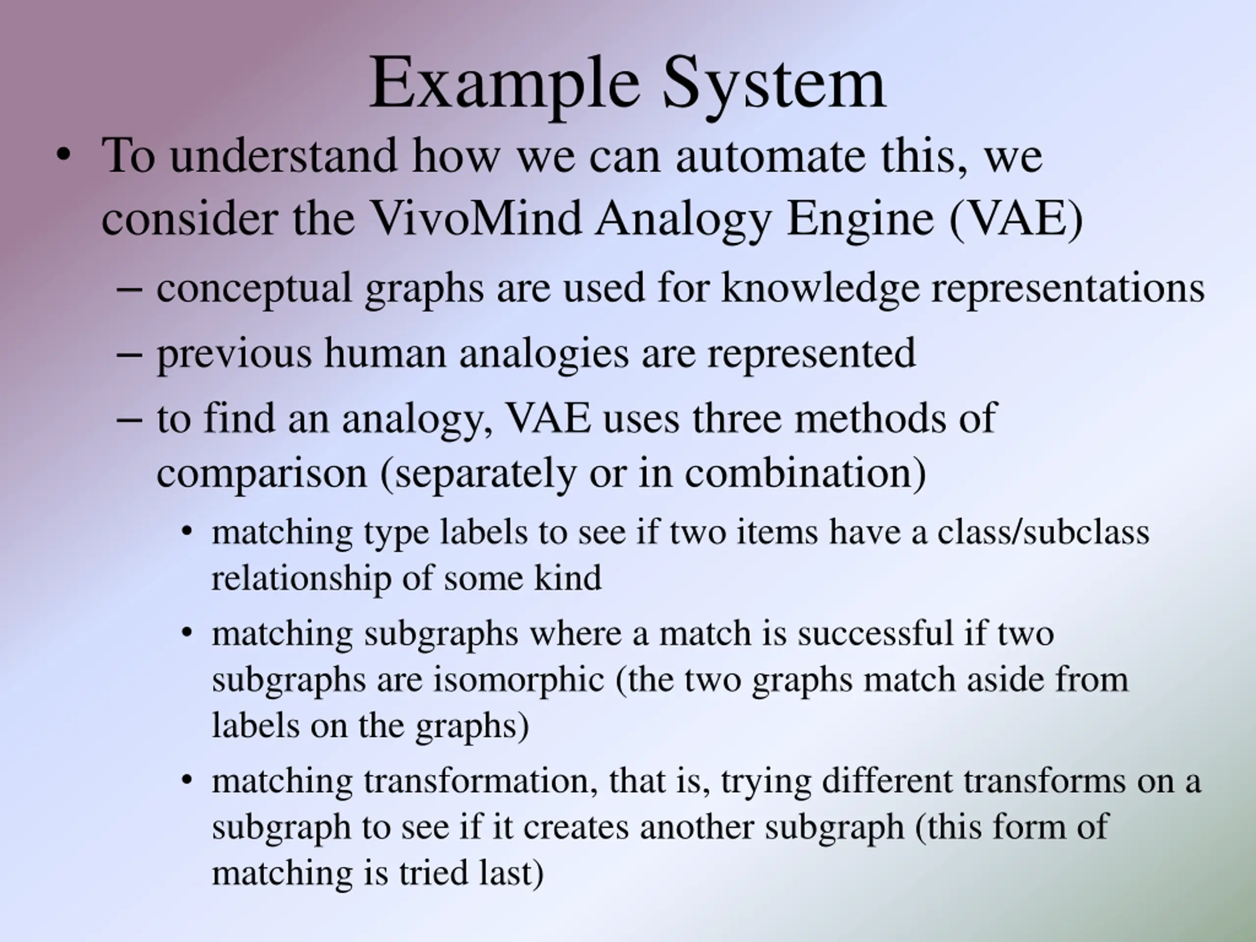 Example System To understand how we can automate this, we consider the VivoMind Analogy Engine (VAE) conceptual graphs are used for knowledge representations previous human analogies are represented to find an analogy, VAE uses three methods of comparison (separately or in combination) matching type labels to see if two items have a class/subclass relationship of some kind matching subgraphs where a match is successful if two subgraphs are isomorphic (the two graphs match aside from labels on the graphs) matching transformation, that is, trying different transforms on a subgraph to see if it creates another subgraph (this form of matching is tried last)