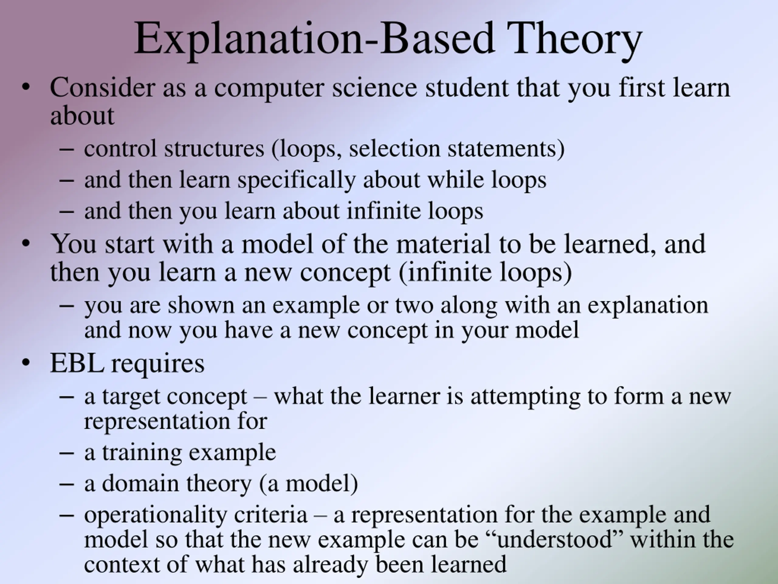 Explanation-Based Theory Consider as a computer science student that you first learn about control structures (loops, selection statements) and then learn specifically about while loops and then you learn about infinite loops You start with a model of the material to be learned, and then you learn a new concept (infinite loops) you are shown an example or two along with an explanation and now you have a new concept in your model EBL requires a target concept what the learner is attempting to form a new representation for a training example a domain theory (a model) operationality criteria a representation for the example and model so that the new example can be understood within the context of what has already been learned