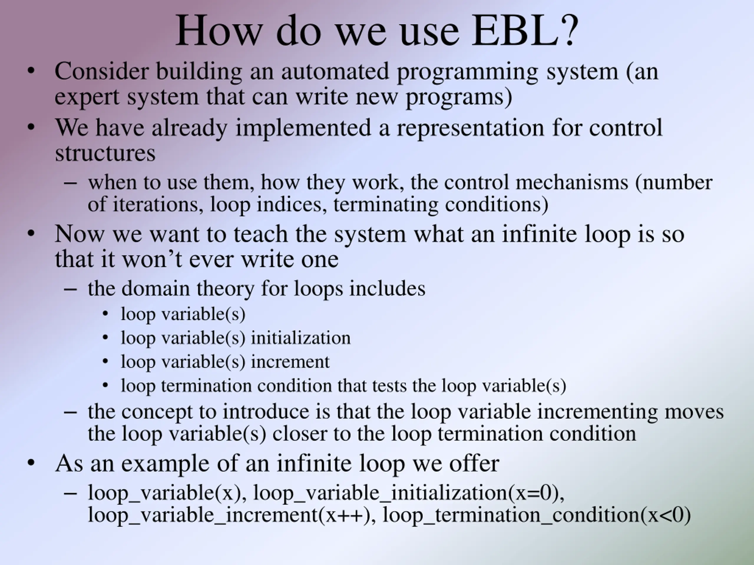 How do we use EBL? Consider building an automated programming system (an expert system that can write new programs) We have already implemented a representation for control structures when to use them, how they work, the control mechanisms (number of iterations, loop indices, terminating conditions) Now we want to teach the system what an infinite loop is so that it won t ever write one the domain theory for loops includes loop variable(s) loop variable(s) initialization loop variable(s) increment loop termination condition that tests the loop variable(s) the concept to introduce is that the loop variable incrementing moves the loop variable(s) closer to the loop termination condition As an example of an infinite loop we offer loop_variable(x), loop_variable_initialization(x=0), loop_variable_increment(x++), loop_termination_condition(x<0)