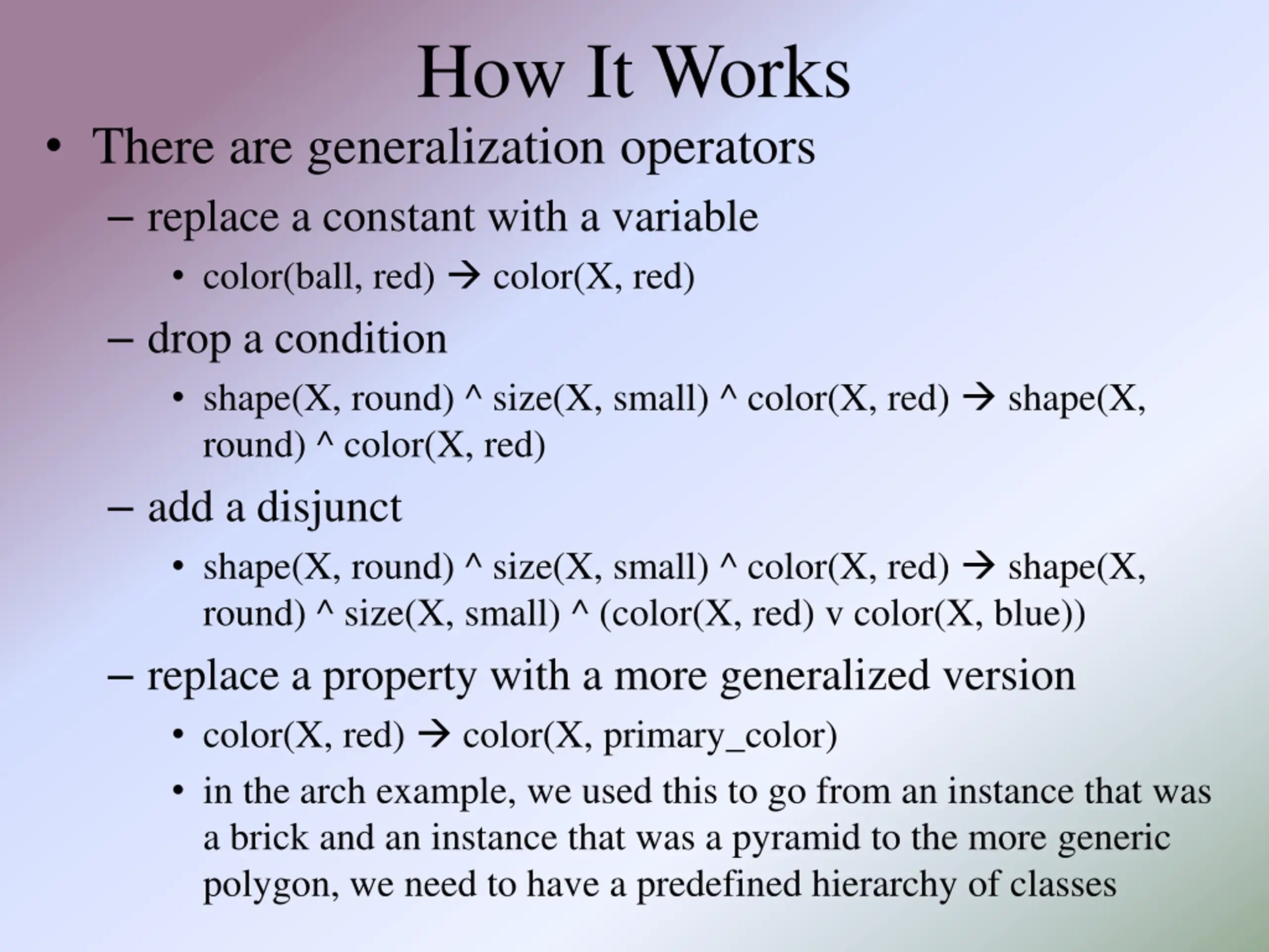 How It Works There are generalization operators replace a constant with a variable color(ball, red) color(X, red) drop a condition shape(X, round) ^ size(X, small) ^ color(X, red) shape(X, round) ^ color(X, red) add a disjunct shape(X, round) ^ size(X, small) ^ color(X, red) shape(X, round) ^ size(X, small) ^ (color(X, red) v color(X, blue)) replace a property with a more generalized version color(X, red) color(X, primary_color) in the arch example, we used this to go from an instance that was a brick and an instance that was a pyramid to the more generic polygon, we need to have a predefined hierarchy of classes