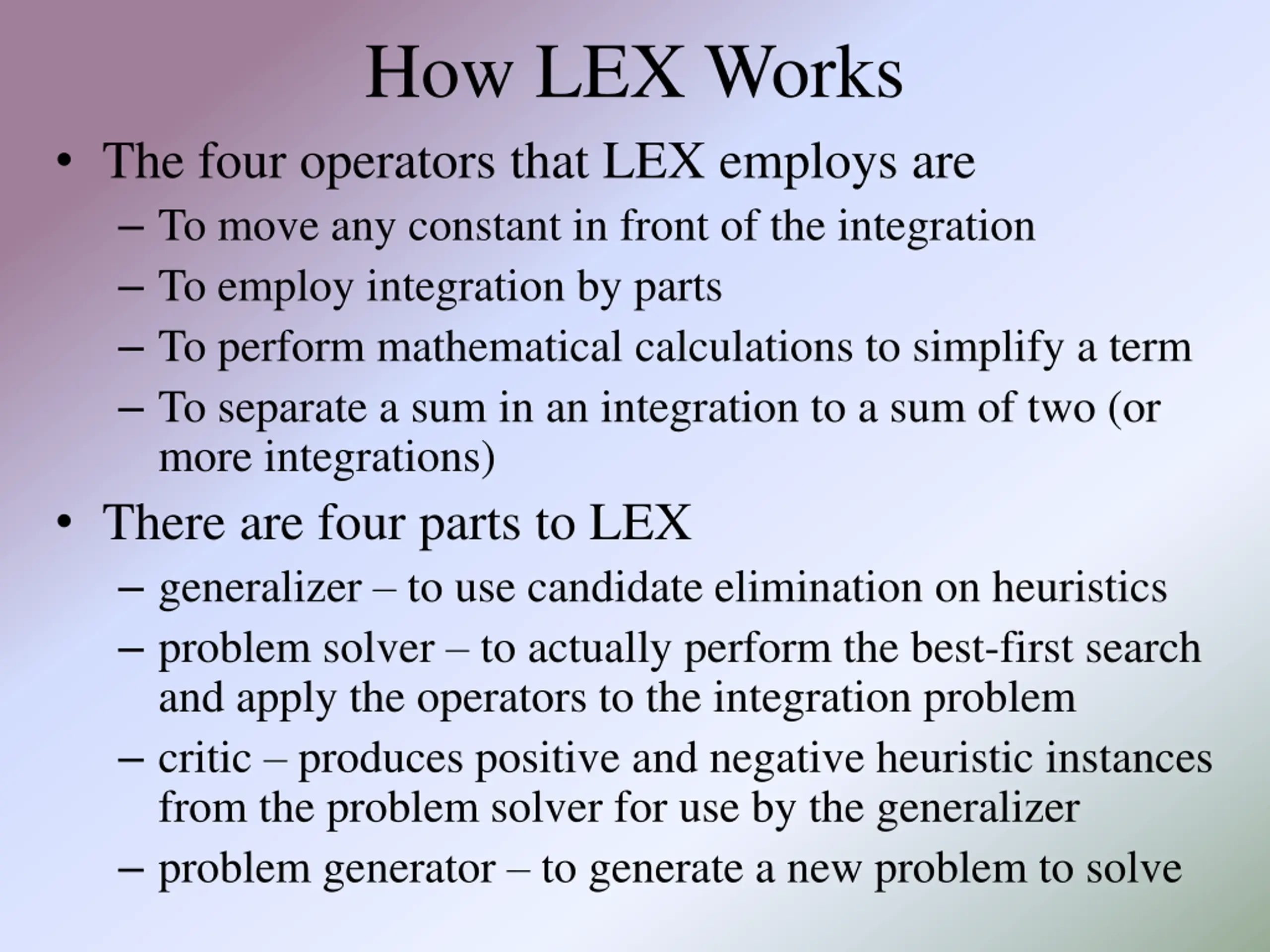 How LEX Works The four operators that LEX employs are To move any constant in front of the integration To employ integration by parts To perform mathematical calculations to simplify a term To separate a sum in an integration to a sum of two (or more integrations) There are four parts to LEX generalizer to use candidate elimination on heuristics problem solver to actually perform the best-first search and apply the operators to the integration problem critic produces positive and negative heuristic instances from the problem solver for use by the generalizer problem generator to generate a new problem to solve