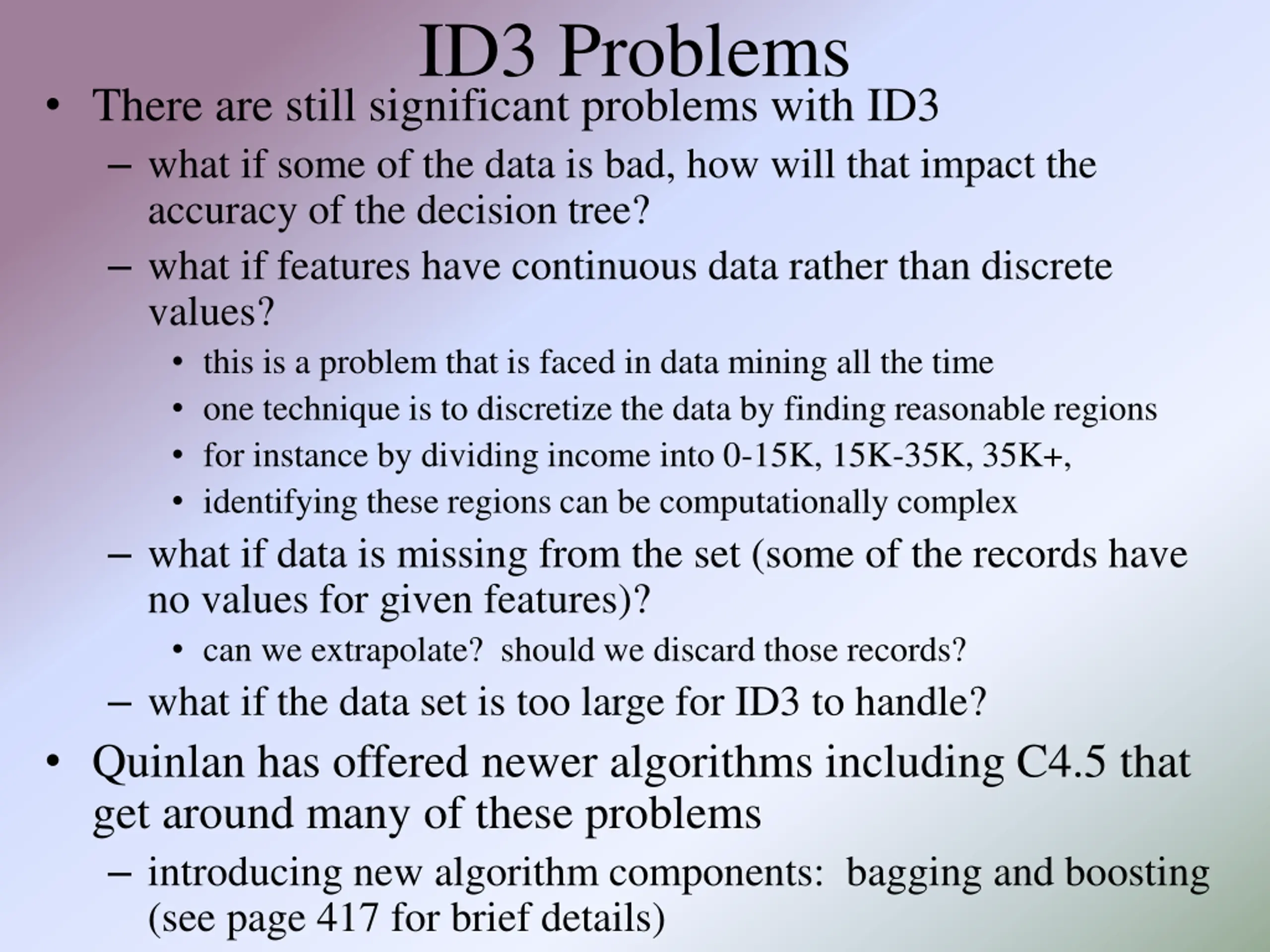 ID3 Problems There are still significant problems with ID3 what if some of the data is bad, how will that impact the accuracy of the decision tree? what if features have continuous data rather than discrete values? this is a problem that is faced in data mining all the time one technique is to discretize the data by finding reasonable regions for instance by dividing income into 0-15K, 15K-35K, 35K+, identifying these regions can be computationally complex what if data is missing from the set (some of the records have no values for given features)? can we extrapolate? should we discard those records? what if the data set is too large for ID3 to handle? Quinlan has offered newer algorithms including C4.5 that get around many of these problems introducing new algorithm components: bagging and boosting (see page 417 for brief details)