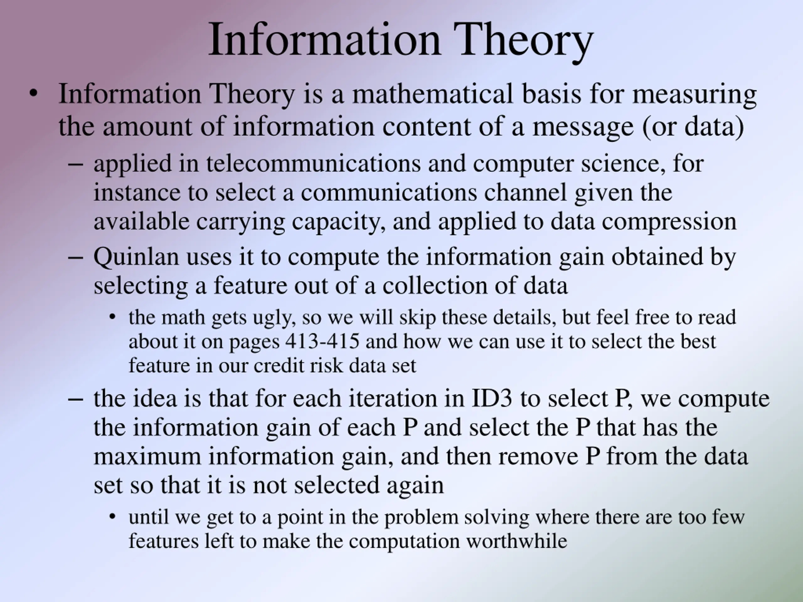 Information Theory Information Theory is a mathematical basis for measuring the amount of information content of a message (or data) applied in telecommunications and computer science, for instance to select a communications channel given the available carrying capacity, and applied to data compression Quinlan uses it to compute the information gain obtained by selecting a feature out of a collection of data the math gets ugly, so we will skip these details, but feel free to read about it on pages 413-415 and how we can use it to select the best feature in our credit risk data set the idea is that for each iteration in ID3 to select P, we compute the information gain of each P and select the P that has the maximum information gain, and then remove P from the data set so that it is not selected again until we get to a point in the problem solving where there are too few features left to make the computation worthwhile