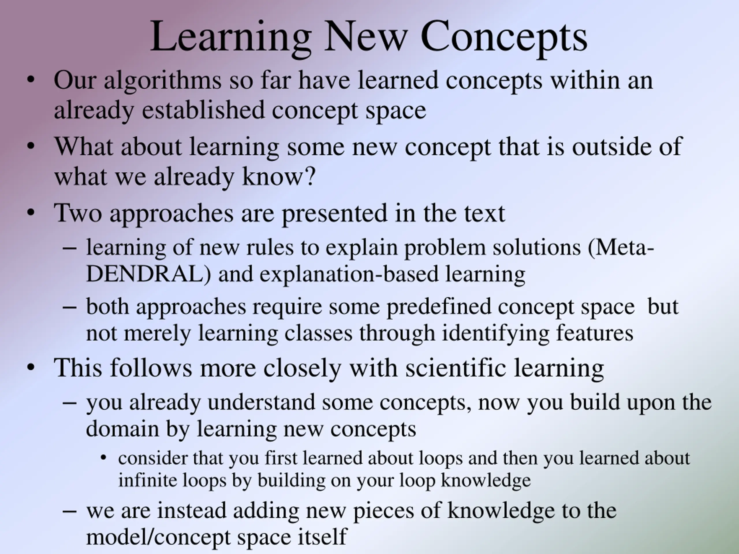 Learning New Concepts Our algorithms so far have learned concepts within an already established concept space What about learning some new concept that is outside of what we already know? Two approaches are presented in the text learning of new rules to explain problem solutions (Meta- DENDRAL) and explanation-based learning both approaches require some predefined concept space but not merely learning classes through identifying features This follows more closely with scientific learning you already understand some concepts, now you build upon the domain by learning new concepts consider that you first learned about loops and then you learned about infinite loops by building on your loop knowledge we are instead adding new pieces of knowledge to the model/concept space itself