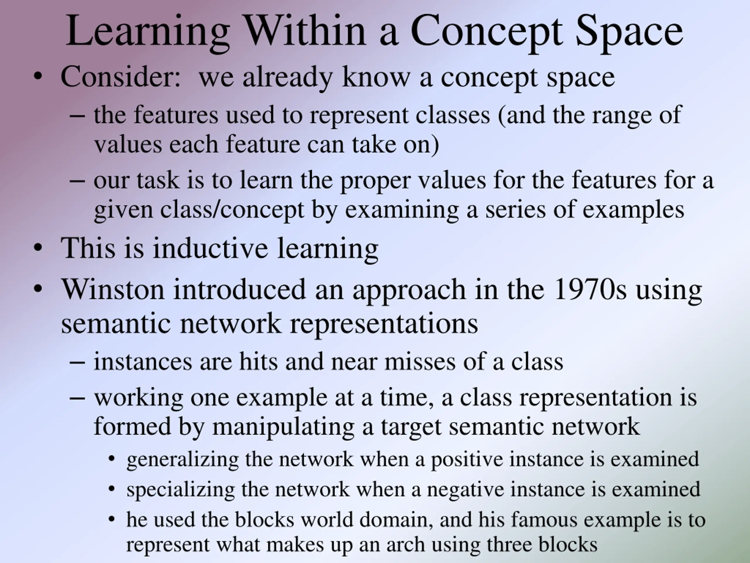 Learning Within a Concept Space Consider: we already know a concept space the features used to represent classes (and the range of values each feature can take on) our task is to learn the proper values for the features for a given class/concept by examining a series of examples This is inductive learning Winston introduced an approach in the 1970s using semantic network representations instances are hits and near misses of a class working one example at a time, a class representation is formed by manipulating a target semantic network generalizing the network when a positive instance is examined specializing the network when a negative instance is examined he used the blocks world domain, and his famous example is to represent what makes up an arch using three blocks