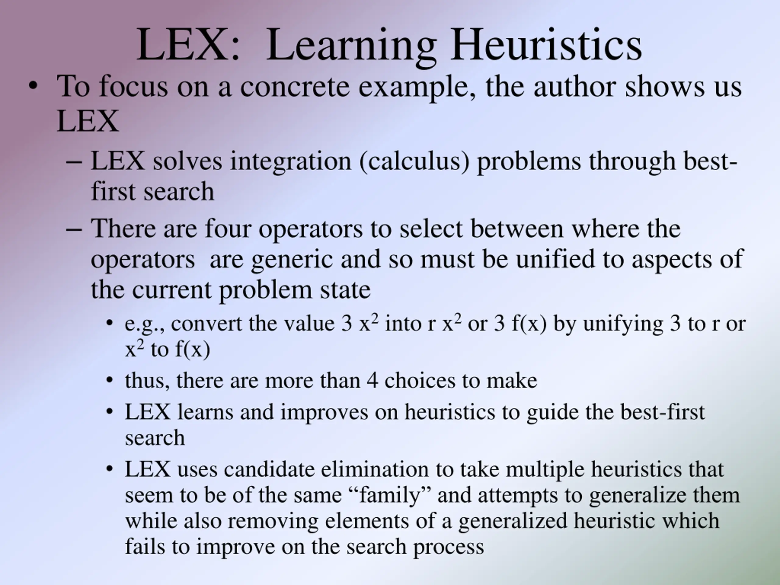 LEX: Learning Heuristics To focus on a concrete example, the author shows us LEX LEX solves integration (calculus) problems through best- first search There are four operators to select between where the operators are generic and so must be unified to aspects of the current problem state e.g., convert the value 3 x2 into r x2 or 3 f(x) by unifying 3 to r or x2 to f(x) thus, there are more than 4 choices to make LEX learns and improves on heuristics to guide the best-first search LEX uses candidate elimination to take multiple heuristics that seem to be of the same family and attempts to generalize them while also removing elements of a generalized heuristic which fails to improve on the search process