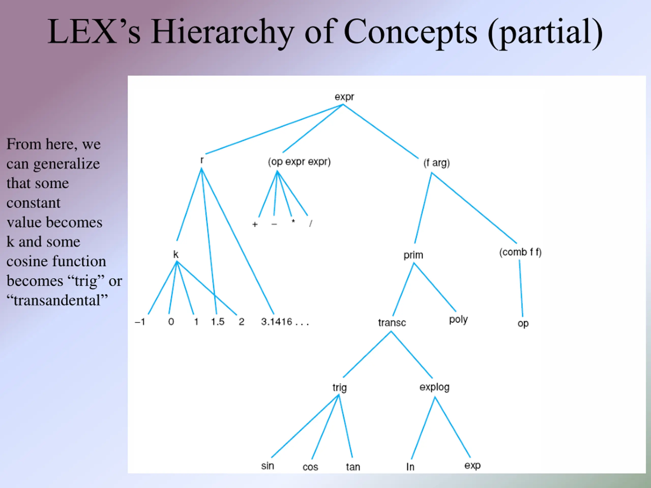 LEXs Hierarchy of Concepts (partial) From here, we can generalize that some constant value becomes k and some cosine function becomes trig or transandental