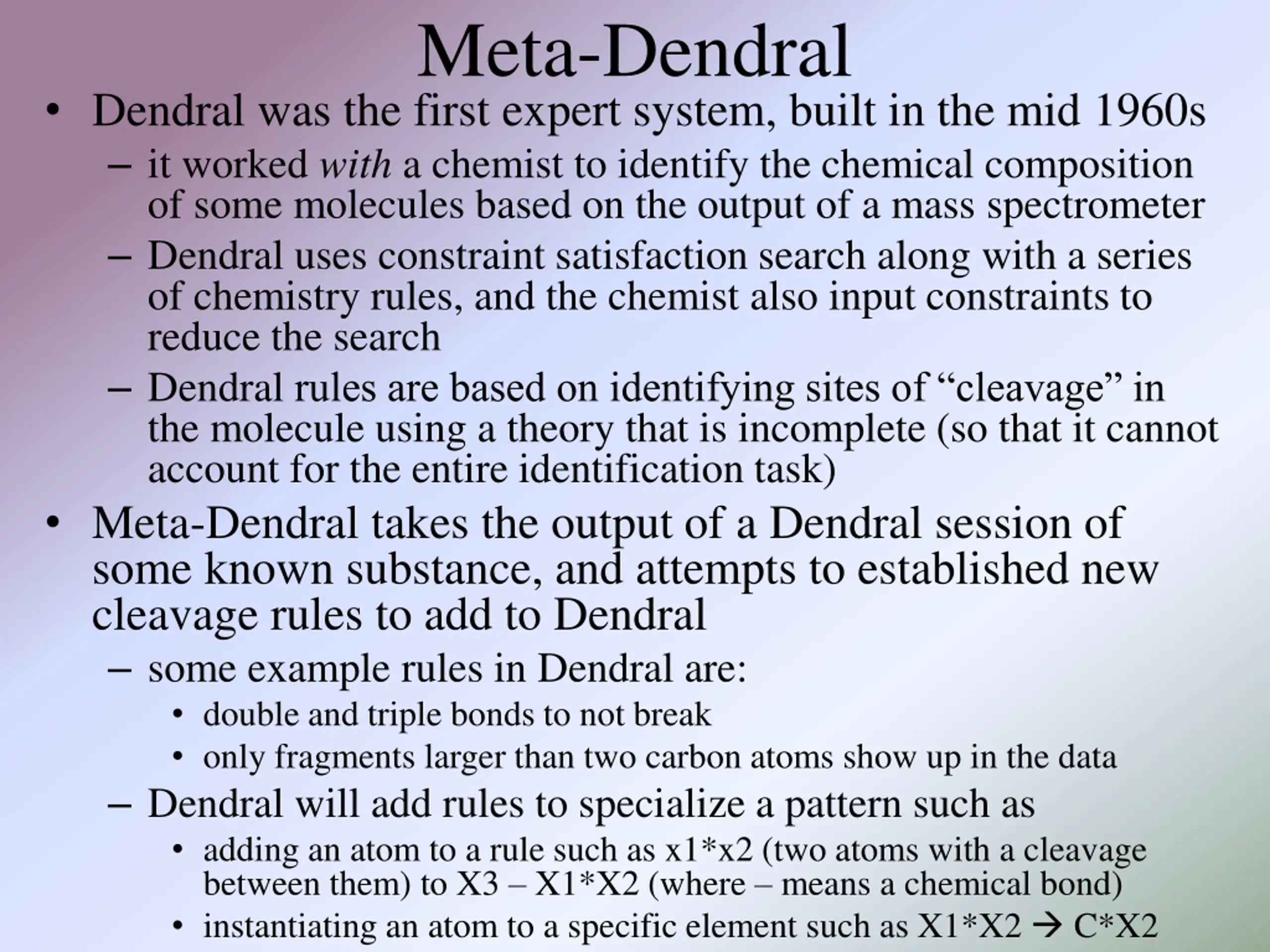 Meta-Dendral Dendral was the first expert system, built in the mid 1960s it worked with a chemist to identify the chemical composition of some molecules based on the output of a mass spectrometer Dendral uses constraint satisfaction search along with a series of chemistry rules, and the chemist also input constraints to reduce the search Dendral rules are based on identifying sites of cleavage in the molecule using a theory that is incomplete (so that it cannot account for the entire identification task) Meta-Dendral takes the output of a Dendral session of some known substance, and attempts to established new cleavage rules to add to Dendral some example rules in Dendral are: double and triple bonds to not break only fragments larger than two carbon atoms show up in the data Dendral will add rules to specialize a pattern such as adding an atom to a rule such as x1*x2 (two atoms with a cleavage between them) to X3 X1*X2 (where means a chemical bond) instantiating an atom to a specific element such as X1*X2 C*X2