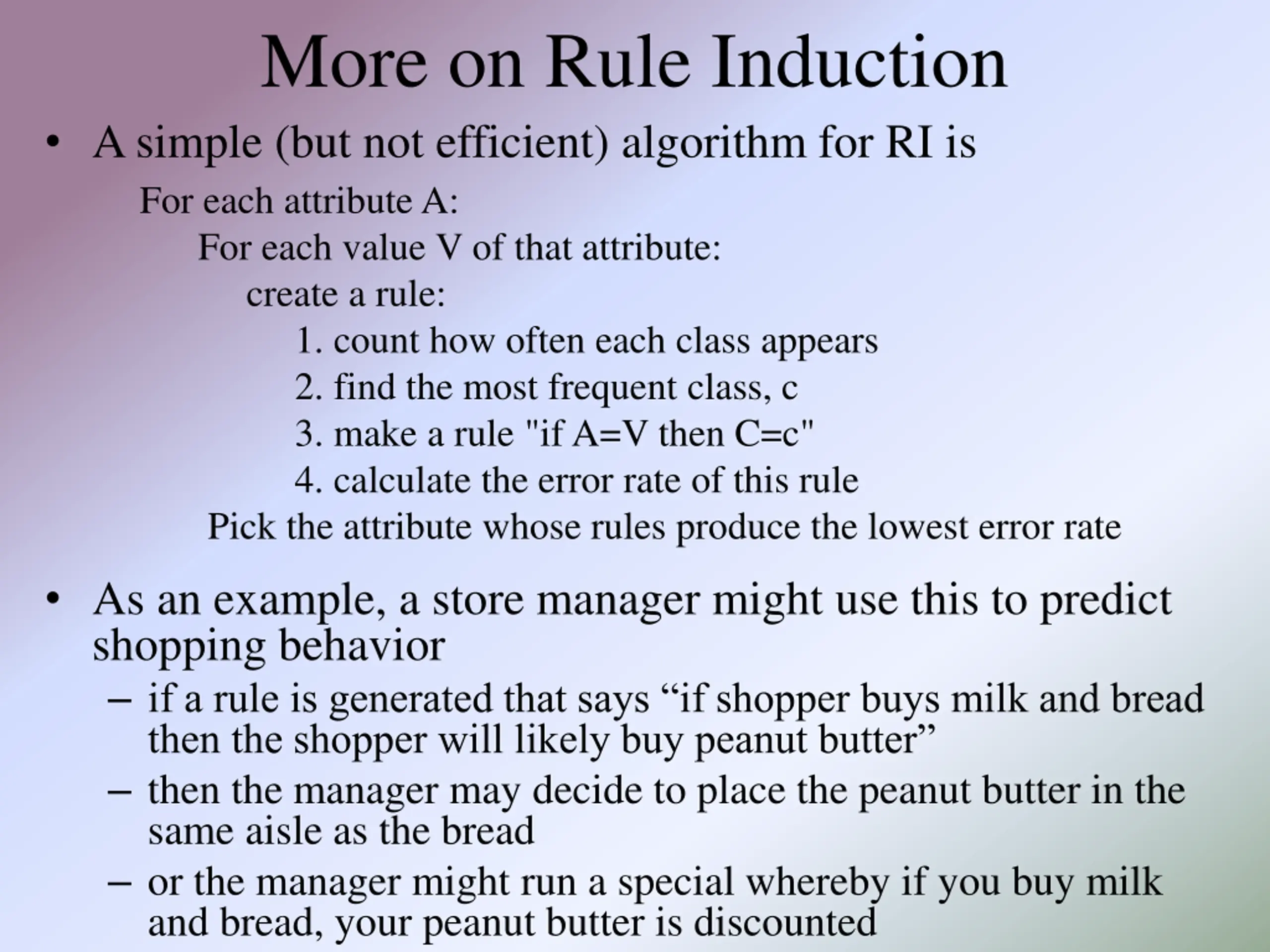 More on Rule Induction A simple (but not efficient) algorithm for RI is For each attribute A: For each value V of that attribute: create a rule: 1. count how often each class appears 2. find the most frequent class, c 3. make a rule "if A=V then C=c" 4. calculate the error rate of this rule Pick the attribute whose rules produce the lowest error rate As an example, a store manager might use this to predict shopping behavior if a rule is generated that says if shopper buys milk and bread then the shopper will likely buy peanut butter then the manager may decide to place the peanut butter in the same aisle as the bread or the manager might run a special whereby if you buy milk and bread, your peanut butter is discounted