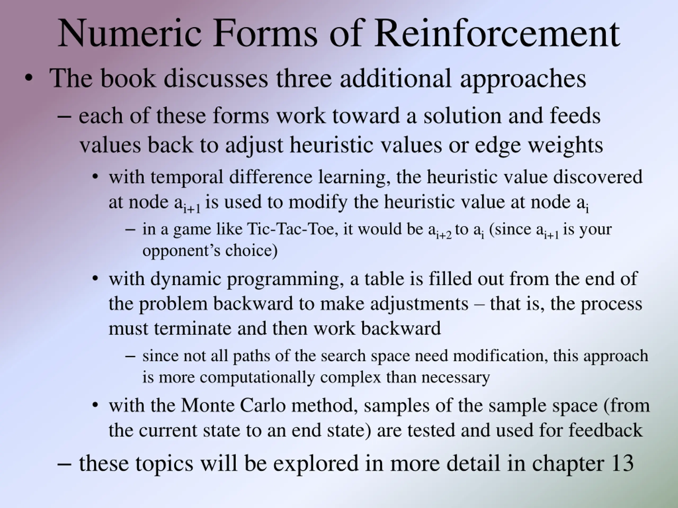 Numeric Forms of Reinforcement The book discusses three additional approaches each of these forms work toward a solution and feeds values back to adjust heuristic values or edge weights with temporal difference learning, the heuristic value discovered at node ai+1 is used to modify the heuristic value at node ai in a game like Tic-Tac-Toe, it would be ai+2 to ai (since ai+1 is your opponent s choice) with dynamic programming, a table is filled out from the end of the problem backward to make adjustments that is, the process must terminate and then work backward since not all paths of the search space need modification, this approach is more computationally complex than necessary with the Monte Carlo method, samples of the sample space (from the current state to an end state) are tested and used for feedback these topics will be explored in more detail in chapter 13