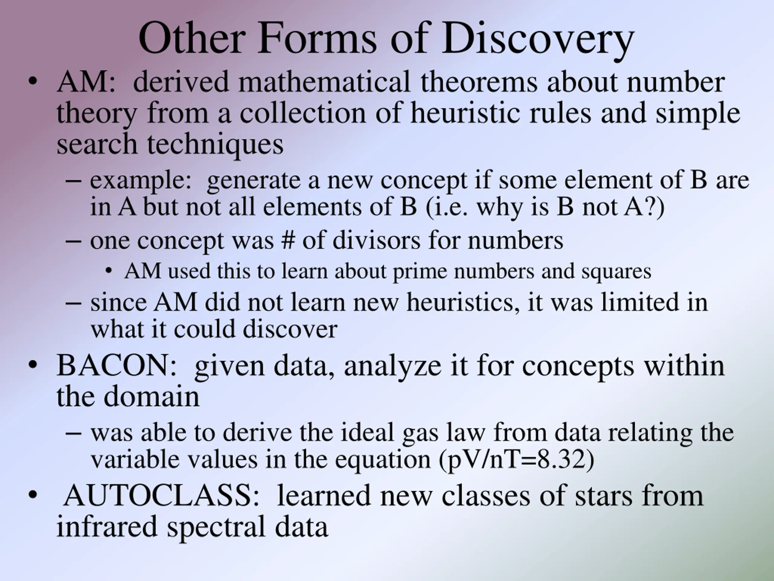 Other Forms of Discovery AM: derived mathematical theorems about number theory from a collection of heuristic rules and simple search techniques example: generate a new concept if some element of B are in A but not all elements of B (i.e. why is B not A?) one concept was # of divisors for numbers AM used this to learn about prime numbers and squares since AM did not learn new heuristics, it was limited in what it could discover BACON: given data, analyze it for concepts within the domain was able to derive the ideal gas law from data relating the variable values in the equation (pV/nT=8.32) AUTOCLASS: learned new classes of stars from infrared spectral data
