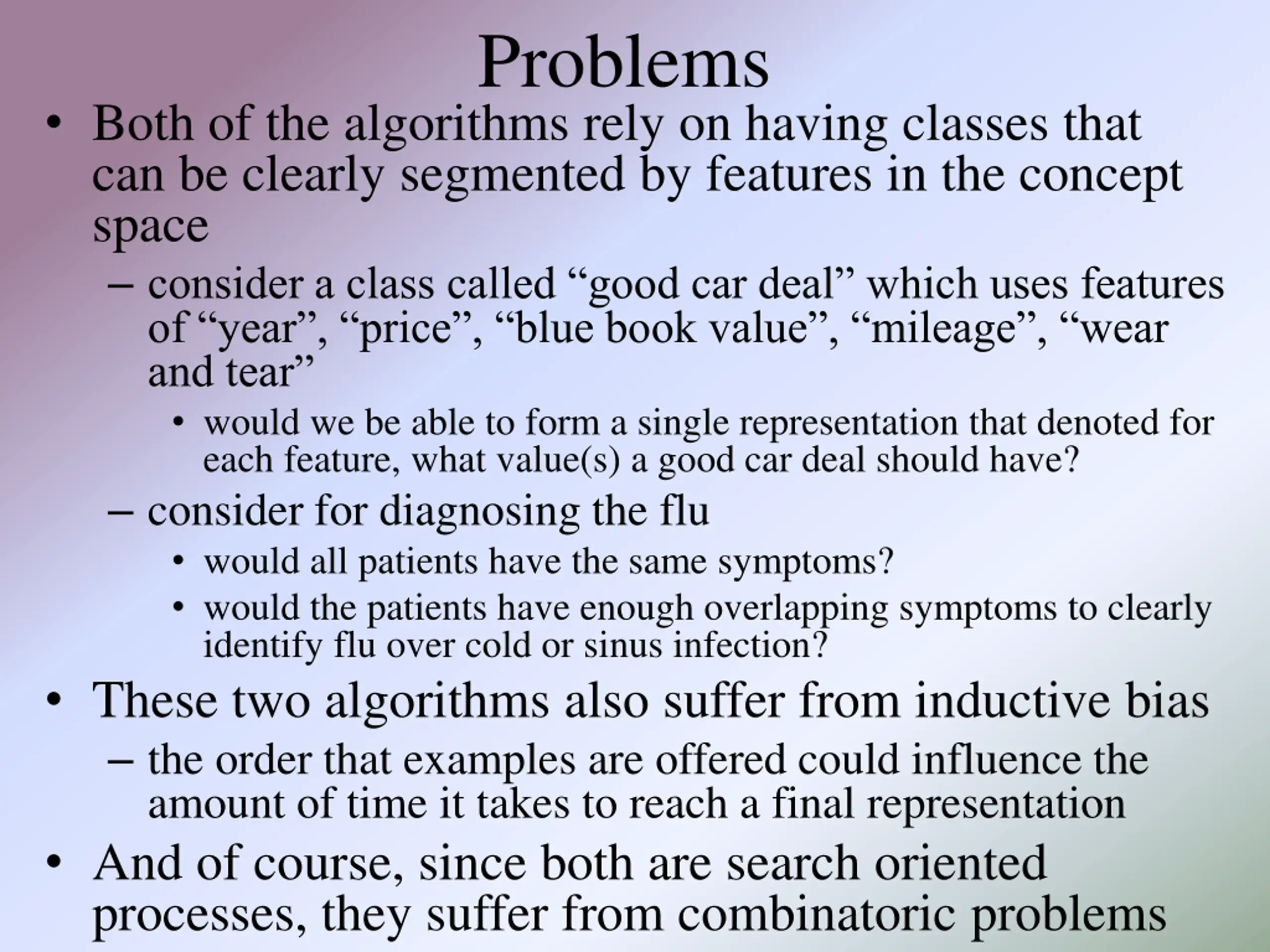 Problems Both of the algorithms rely on having classes that can be clearly segmented by features in the concept space consider a class called good car deal which uses features of year , price , blue book value , mileage , wear and tear would we be able to form a single representation that denoted for each feature, what value(s) a good car deal should have? consider for diagnosing the flu would all patients have the same symptoms? would the patients have enough overlapping symptoms to clearly identify flu over cold or sinus infection? These two algorithms also suffer from inductive bias the order that examples are offered could influence the amount of time it takes to reach a final representation And of course, since both are search oriented processes, they suffer from combinatoric problems
