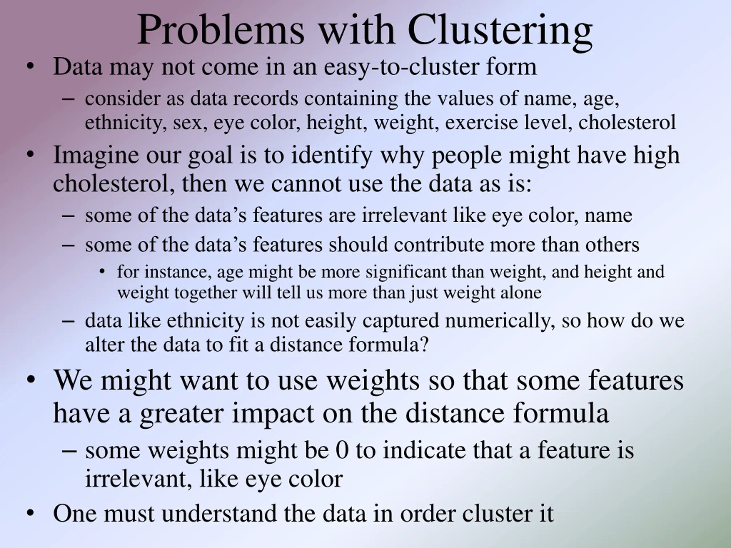 Problems with Clustering Data may not come in an easy-to-cluster form consider as data records containing the values of name, age, ethnicity, sex, eye color, height, weight, exercise level, cholesterol Imagine our goal is to identify why people might have high cholesterol, then we cannot use the data as is: some of the data s features are irrelevant like eye color, name some of the data s features should contribute more than others for instance, age might be more significant than weight, and height and weight together will tell us more than just weight alone data like ethnicity is not easily captured numerically, so how do we alter the data to fit a distance formula? We might want to use weights so that some features have a greater impact on the distance formula some weights might be 0 to indicate that a feature is irrelevant, like eye color One must understand the data in order cluster it