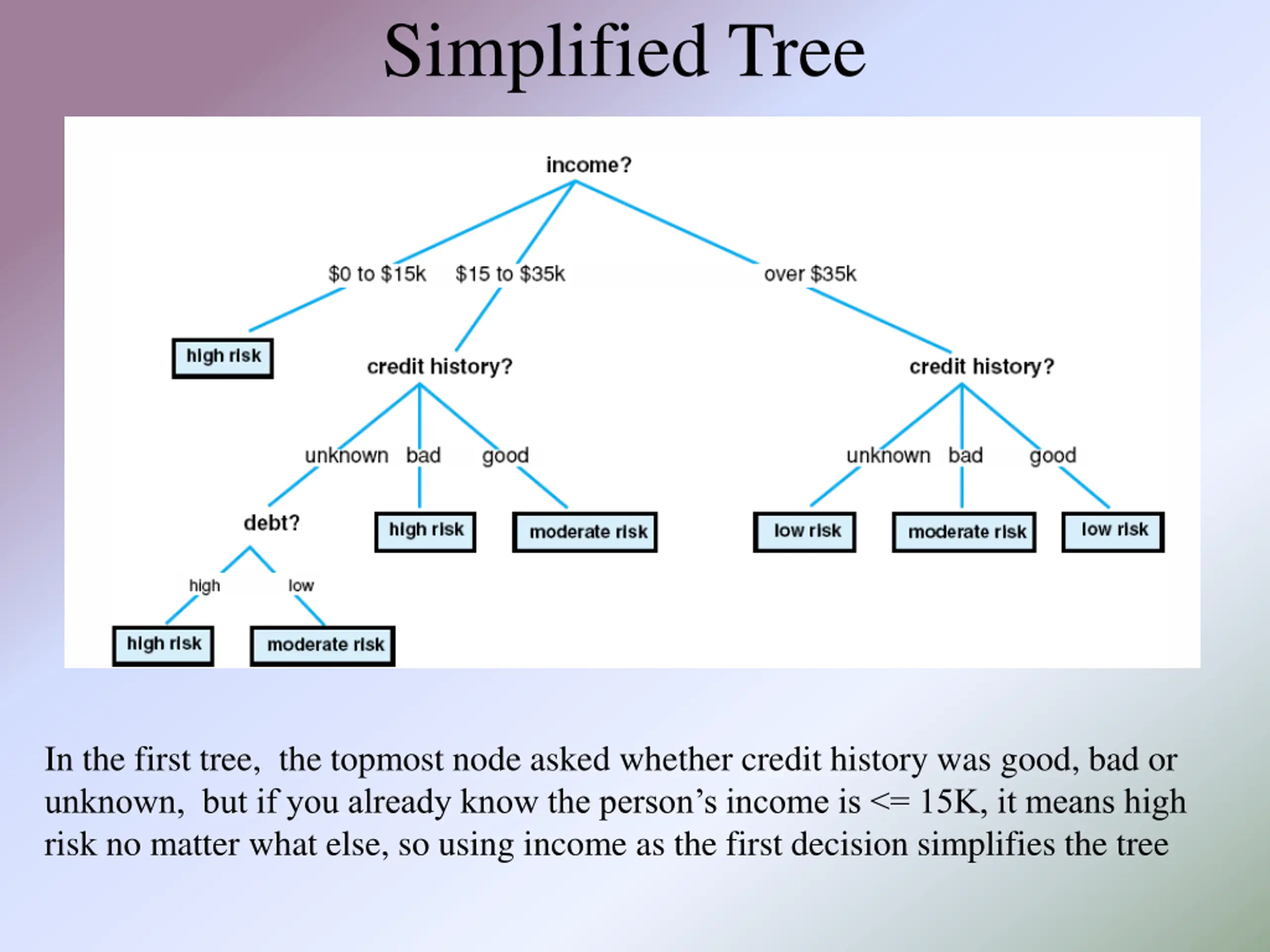 Simplified Tree In the first tree, the topmost node asked whether credit history was good, bad or unknown, but if you already know the person s income is <= 15K, it means high risk no matter what else, so using income as the first decision simplifies the tree