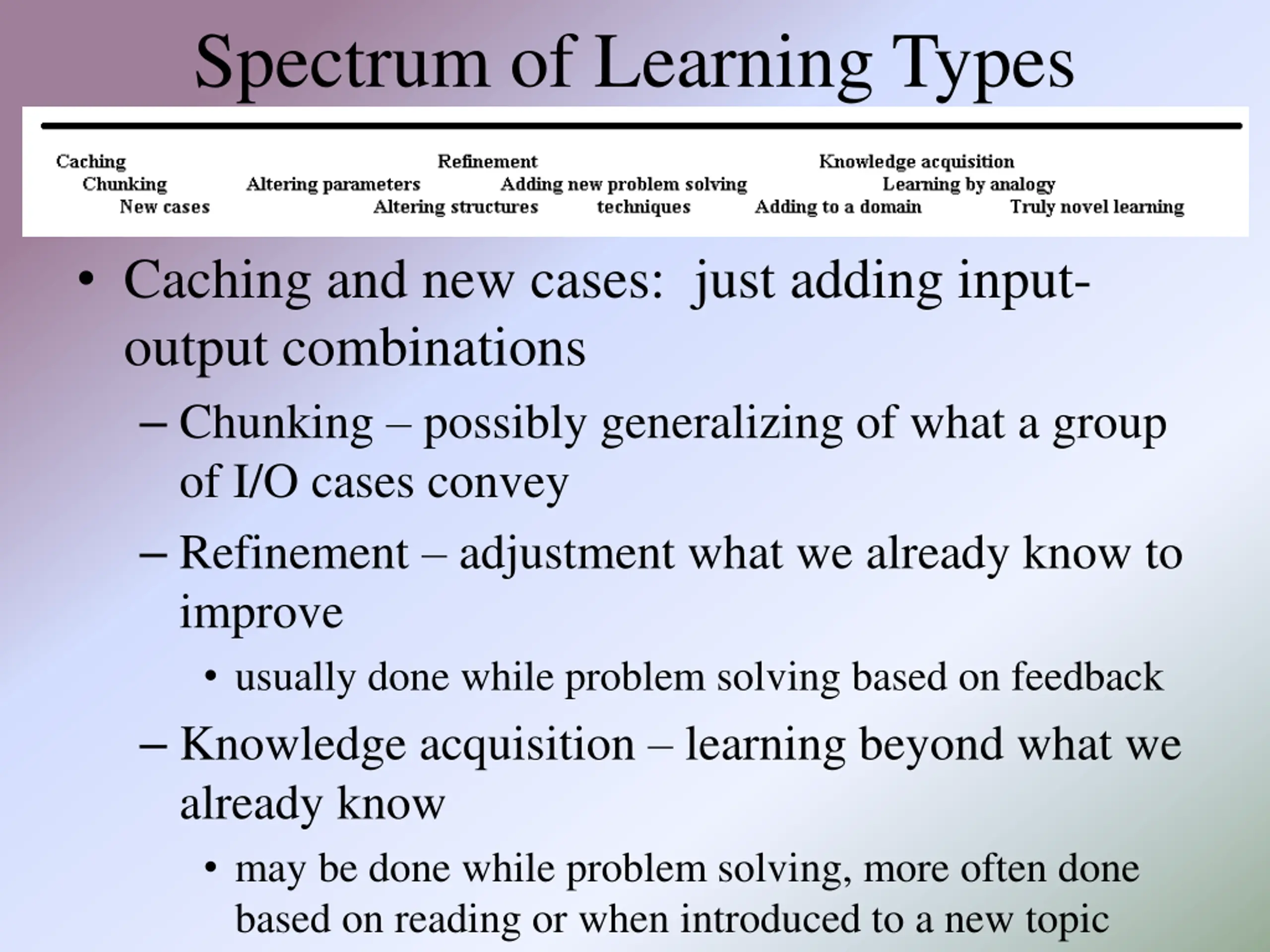 Spectrum of Learning Types Caching and new cases: just adding input- output combinations Chunking possibly generalizing of what a group of I/O cases convey Refinement adjustment what we already know to improve usually done while problem solving based on feedback Knowledge acquisition learning beyond what we already know may be done while problem solving, more often done based on reading or when introduced to a new topic