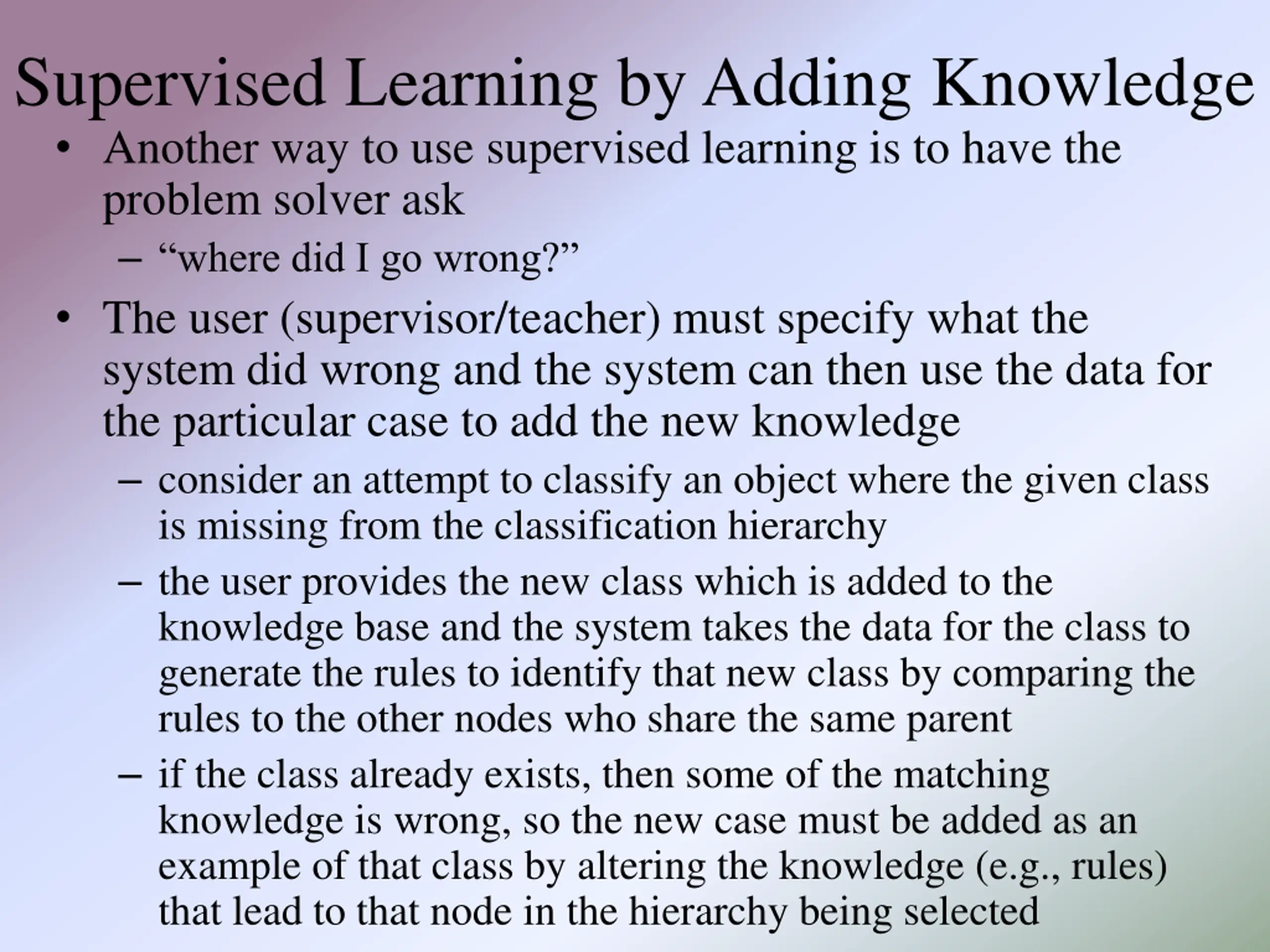 Supervised Learning by Adding Knowledge Another way to use supervised learning is to have the problem solver ask where did I go wrong? The user (supervisor/teacher) must specify what the system did wrong and the system can then use the data for the particular case to add the new knowledge consider an attempt to classify an object where the given class is missing from the classification hierarchy the user provides the new class which is added to the knowledge base and the system takes the data for the class to generate the rules to identify that new class by comparing the rules to the other nodes who share the same parent if the class already exists, then some of the matching knowledge is wrong, so the new case must be added as an example of that class by altering the knowledge (e.g., rules) that lead to that node in the hierarchy being selected