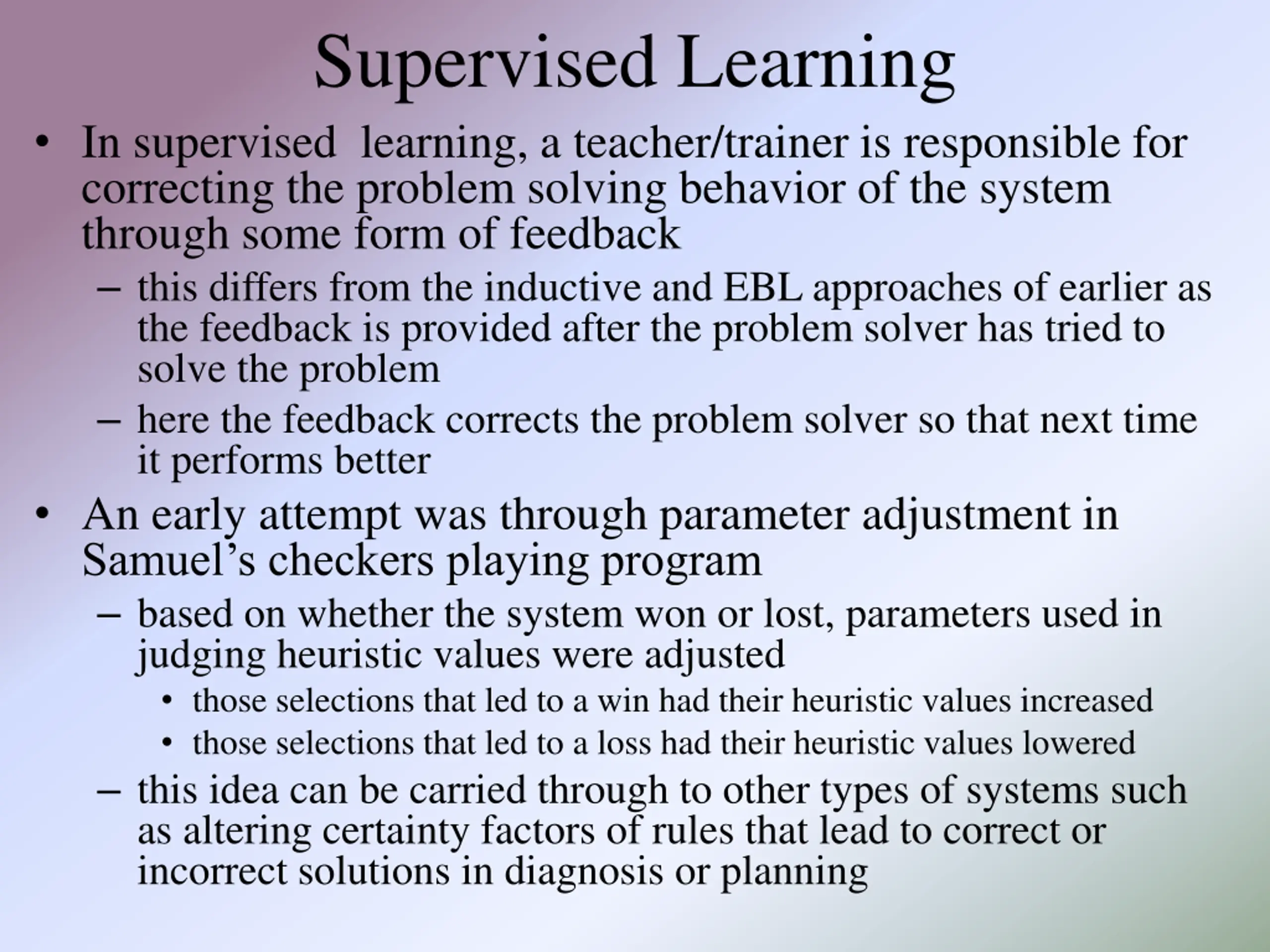Supervised Learning In supervised learning, a teacher/trainer is responsible for correcting the problem solving behavior of the system through some form of feedback this differs from the inductive and EBL approaches of earlier as the feedback is provided after the problem solver has tried to solve the problem here the feedback corrects the problem solver so that next time it performs better An early attempt was through parameter adjustment in Samuel s checkers playing program based on whether the system won or lost, parameters used in judging heuristic values were adjusted those selections that led to a win had their heuristic values increased those selections that led to a loss had their heuristic values lowered this idea can be carried through to other types of systems such as altering certainty factors of rules that lead to correct or incorrect solutions in diagnosis or planning