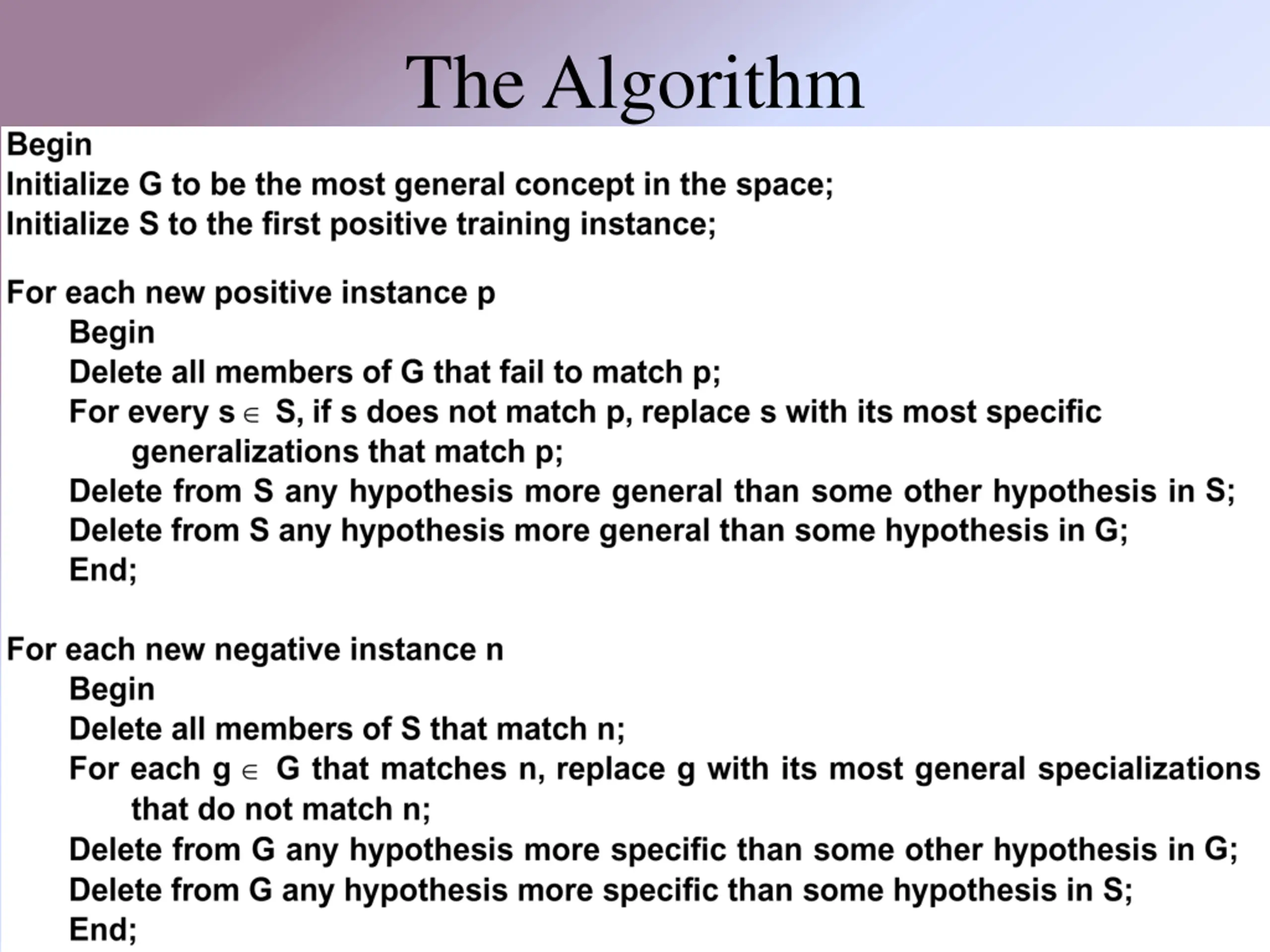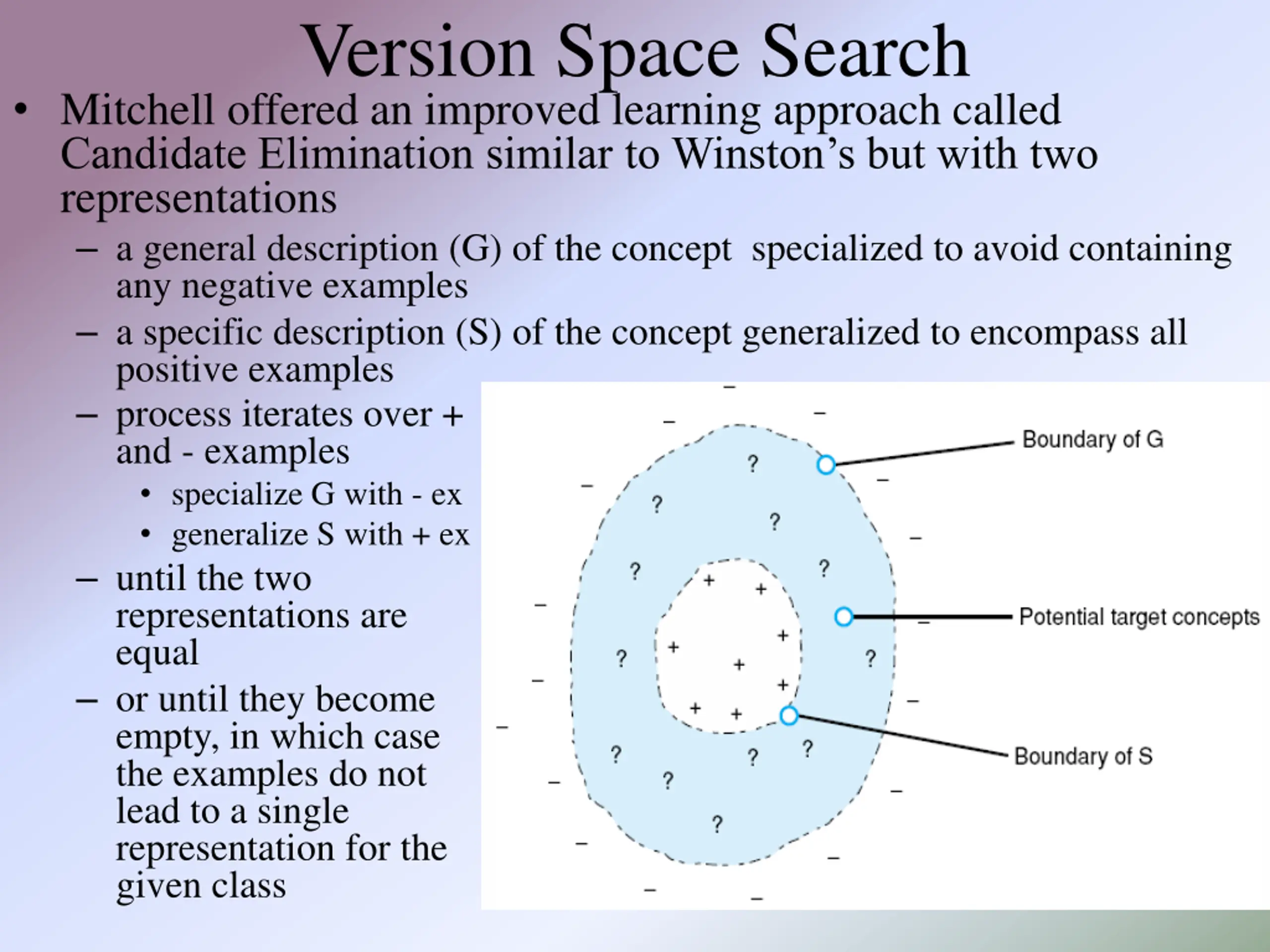 Version Space Search Mitchell offered an improved learning approach called Candidate Elimination similar to Winston s but with two representations a general description (G) of the concept specialized to avoid containing any negative examples a specific description (S) of the concept generalized to encompass all positive examples process iterates over + and - examples specialize G with - ex generalize S with + ex until the two representations are equal or until they become empty, in which case the examples do not lead to a single representation for the given class