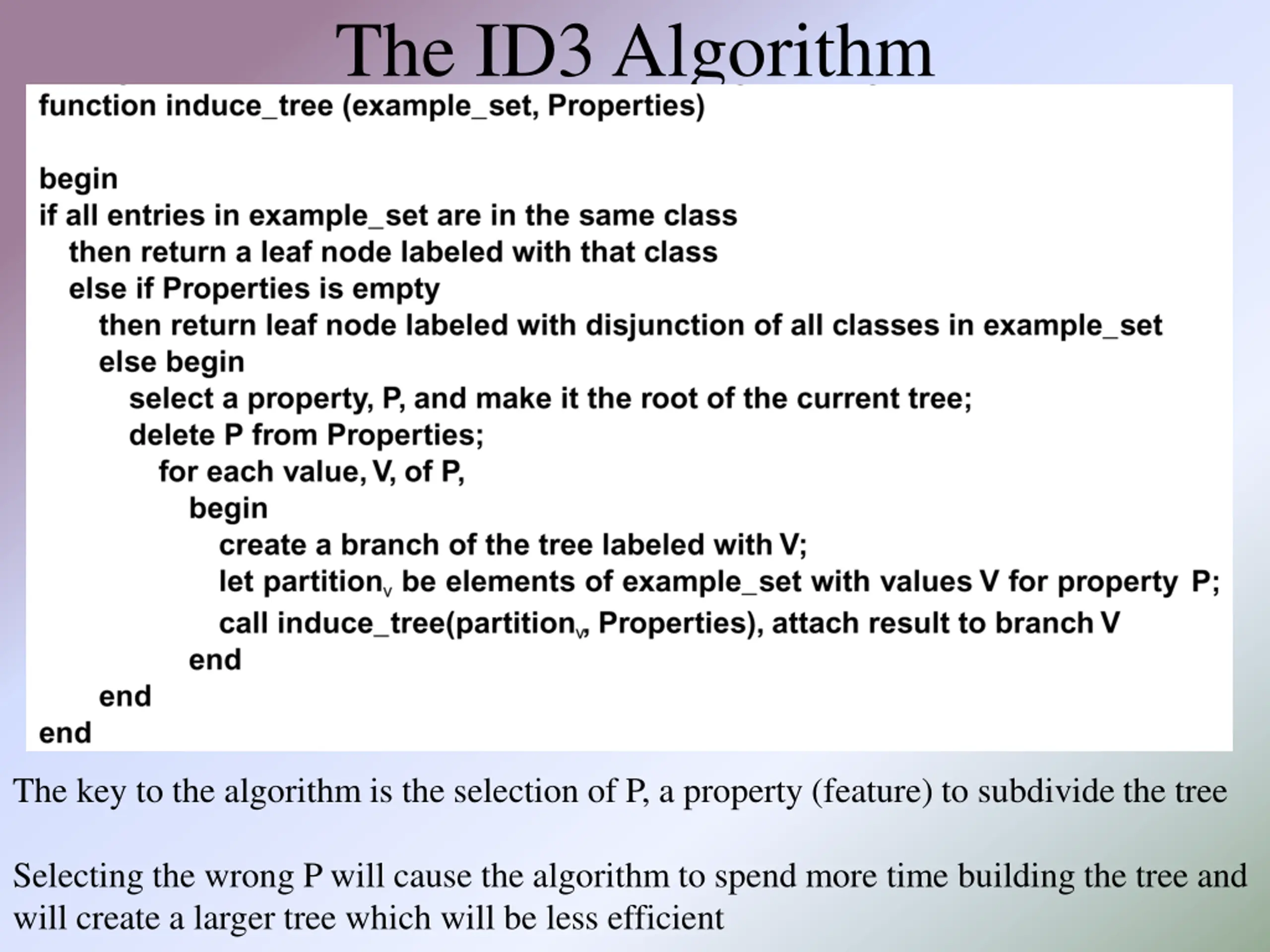 The ID3 Algorithm The key to the algorithm is the selection of P, a property (feature) to subdivide the tree Selecting the wrong P will cause the algorithm to spend more time building the tree and will create a larger tree which will be less efficient