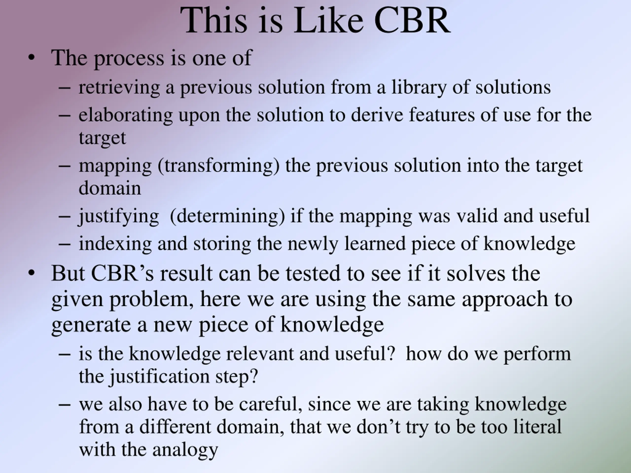 This is Like CBR The process is one of retrieving a previous solution from a library of solutions elaborating upon the solution to derive features of use for the target mapping (transforming) the previous solution into the target domain justifying (determining) if the mapping was valid and useful indexing and storing the newly learned piece of knowledge But CBR s result can be tested to see if it solves the given problem, here we are using the same approach to generate a new piece of knowledge is the knowledge relevant and useful? how do we perform the justification step? we also have to be careful, since we are taking knowledge from a different domain, that we don t try to be too literal with the analogy