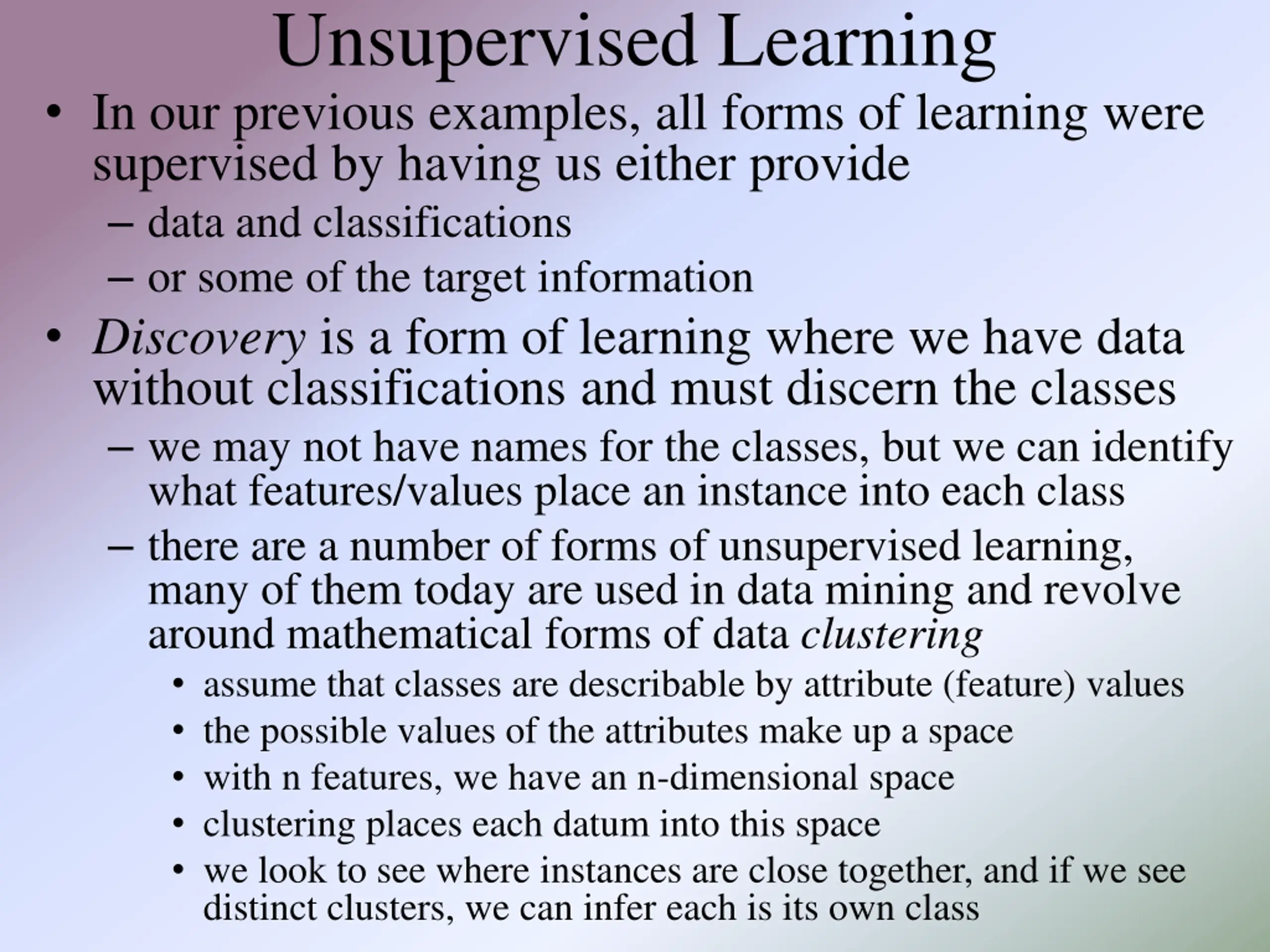 Unsupervised Learning In our previous examples, all forms of learning were supervised by having us either provide data and classifications or some of the target information Discovery is a form of learning where we have data without classifications and must discern the classes we may not have names for the classes, but we can identify what features/values place an instance into each class there are a number of forms of unsupervised learning, many of them today are used in data mining and revolve around mathematical forms of data clustering assume that classes are describable by attribute (feature) values the possible values of the attributes make up a space with n features, we have an n-dimensional space clustering places each datum into this space we look to see where instances are close together, and if we see distinct clusters, we can infer each is its own class
