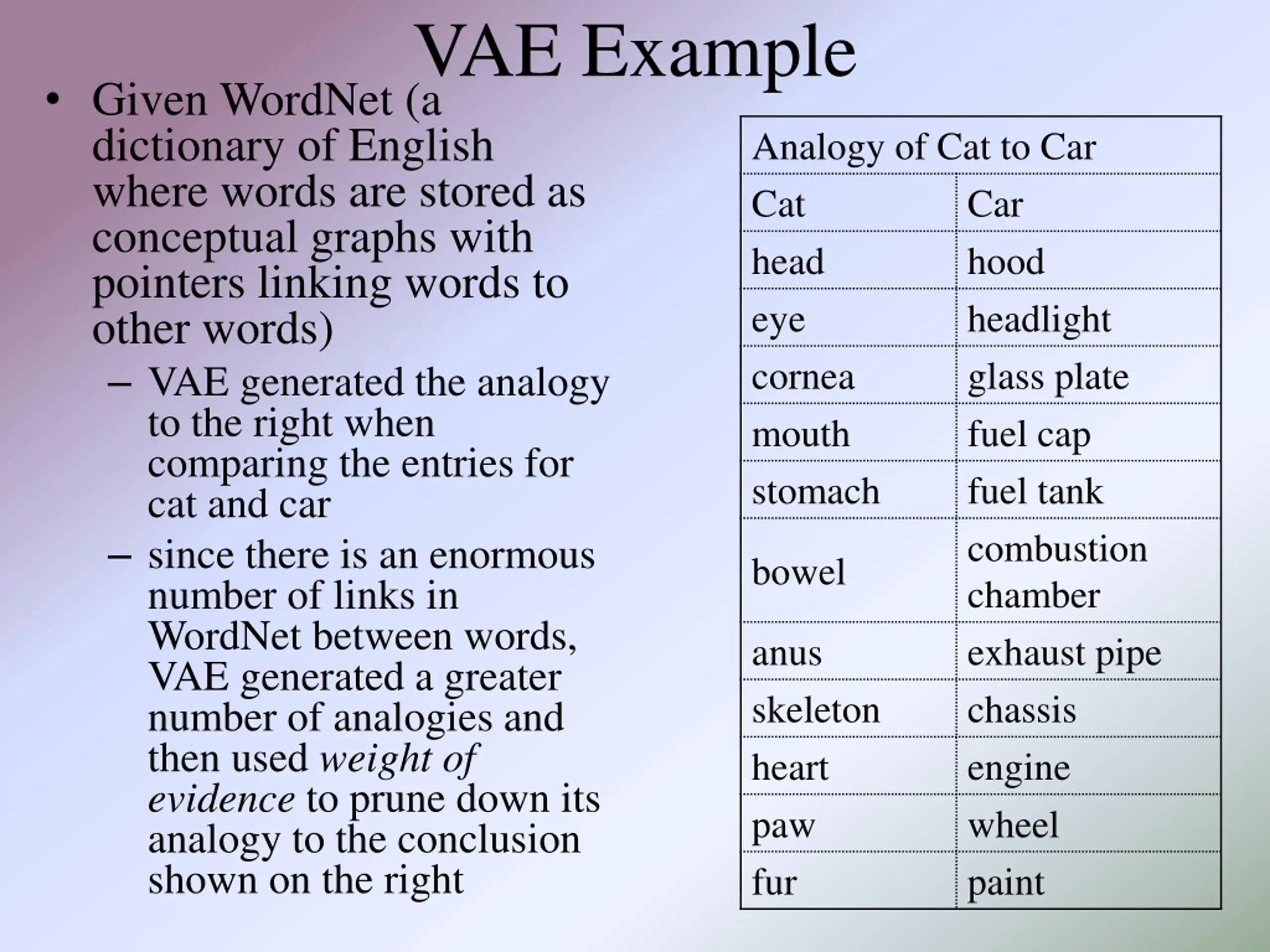 VAE Example Given WordNet (a dictionary of English where words are stored as conceptual graphs with pointers linking words to other words) VAE generated the analogy to the right when comparing the entries for cat and car since there is an enormous number of links in WordNet between words, VAE generated a greater number of analogies and then used weight of evidence to prune down its analogy to the conclusion shown on the right Analogy of Cat to Car Cat head eye cornea mouth stomach Car hood headlight glass plate fuel cap fuel tank combustion chamber exhaust pipe chassis engine wheel paint bowel anus skeleton heart paw fur