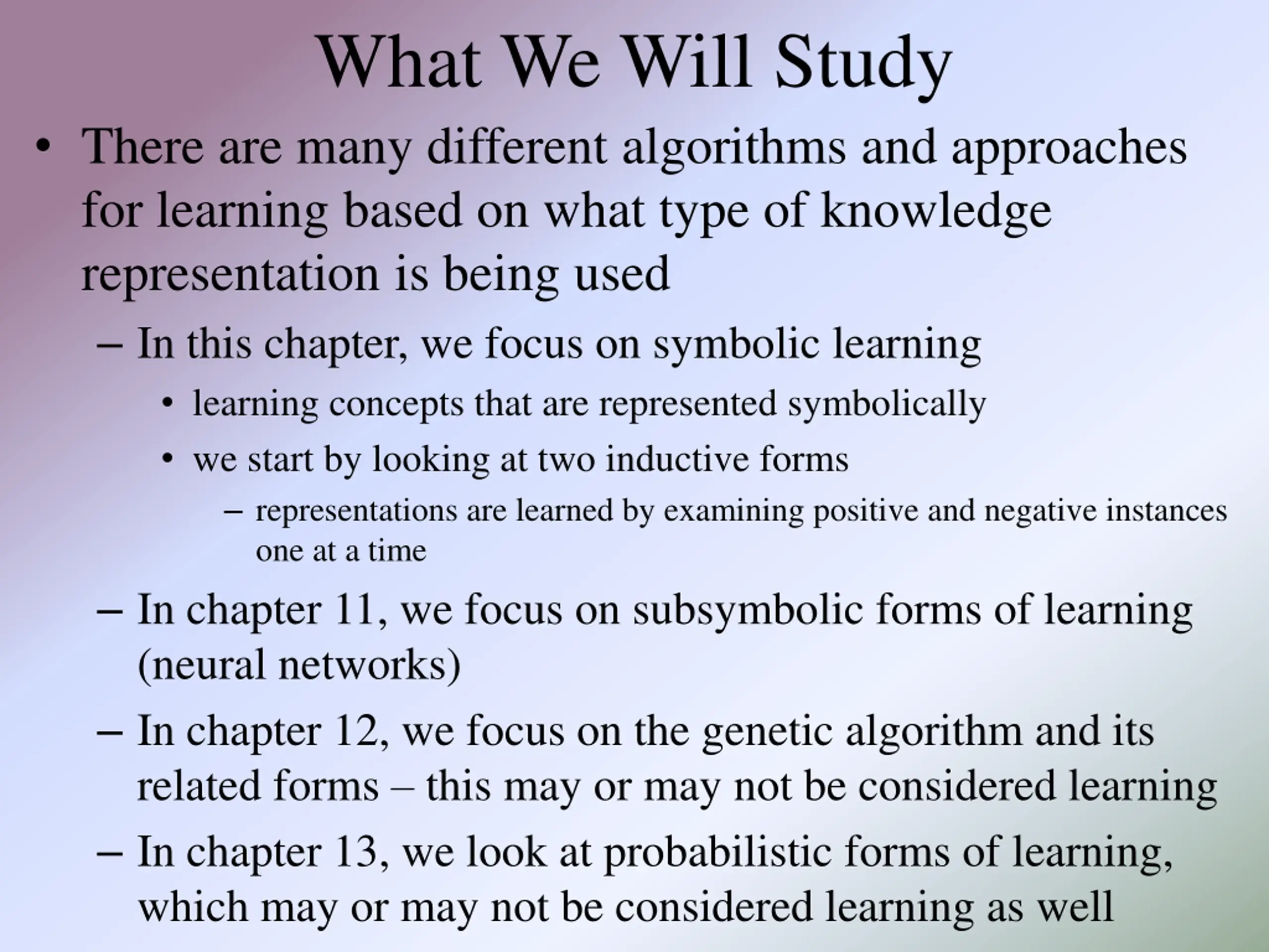 What We Will Study There are many different algorithms and approaches for learning based on what type of knowledge representation is being used In this chapter, we focus on symbolic learning learning concepts that are represented symbolically we start by looking at two inductive forms representations are learned by examining positive and negative instances one at a time In chapter 11, we focus on subsymbolic forms of learning (neural networks) In chapter 12, we focus on the genetic algorithm and its related forms this may or may not be considered learning In chapter 13, we look at probabilistic forms of learning, which may or may not be considered learning as well