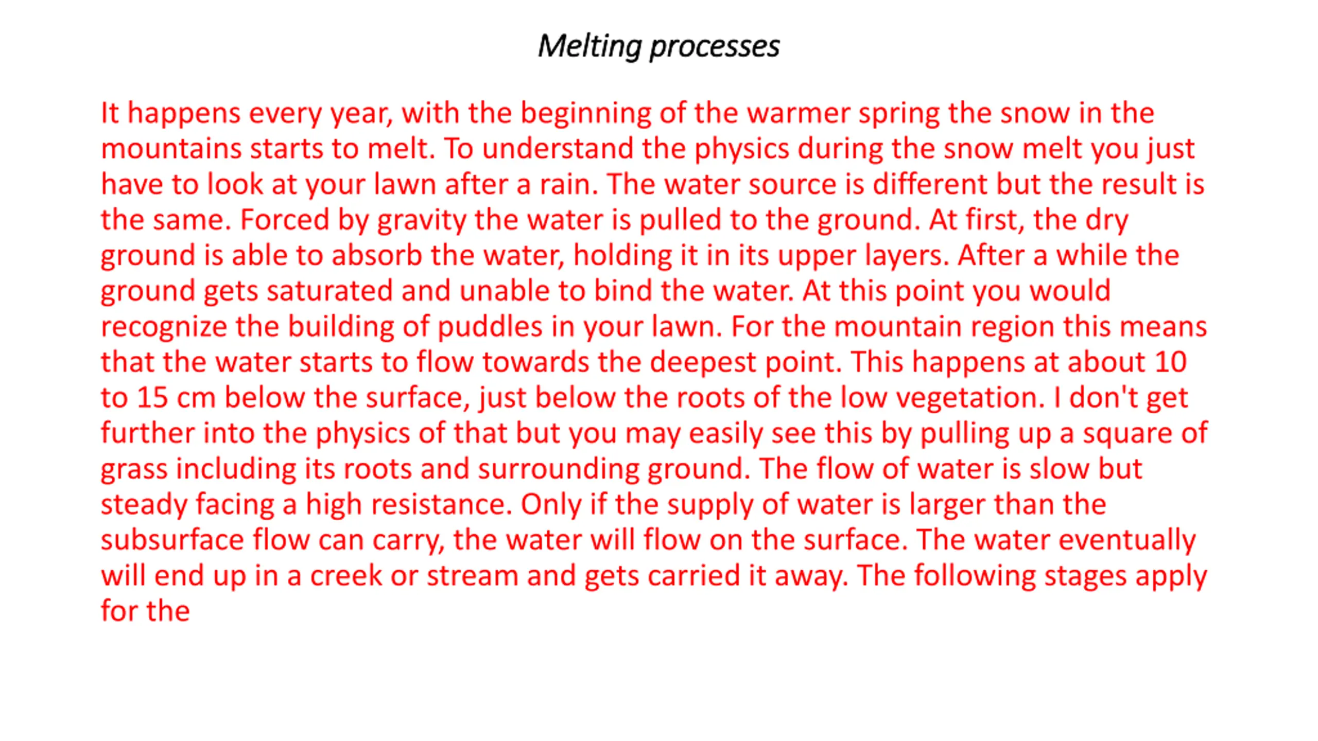 Melting processes Melting processes It happens every year, with the beginning of the warmer spring the snow in the mountains starts to melt. To understand the physics during the snow melt you just have to look at your lawn after a rain. The water source is different but the result is the same. Forced by gravity the water is pulled to the ground. At first, the dry ground is able to absorb the water, holding it in its upper layers. After a while the ground gets saturated and unable to bind the water. At this point you would recognize the building of puddles in your lawn. For the mountain region this means that the water starts to flow towards the deepest point. This happens at about 10 to 15 cm below the surface, just below the roots of the low vegetation. I don't get further into the physics of that but you may easily see this by pulling up a square of grass including its roots and surrounding ground. The flow of water is slow but steady facing a high resistance. Only if the supply of water is larger than the subsurface flow can carry, the water will flow on the surface. The water eventually will end up in a creek or stream and gets carried it away. The following stages apply for the