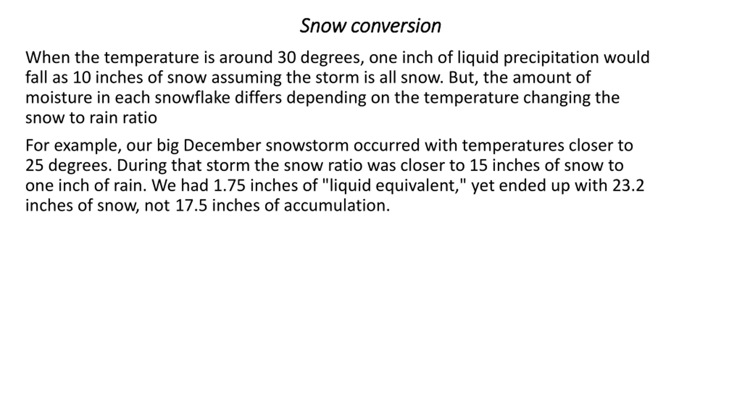 Snow conversion Snow conversion When the temperature is around 30 degrees, one inch of liquid precipitation would fall as 10 inches of snow assuming the storm is all snow. But, the amount of moisture in each snowflake differs depending on the temperature changing the snow to rain ratio For example, our big December snowstorm occurred with temperatures closer to 25 degrees. During that storm the snow ratio was closer to 15 inches of snow to one inch of rain. We had 1.75 inches of "liquid equivalent," yet ended up with 23.2 inches of snow, not 17.5 inches of accumulation.