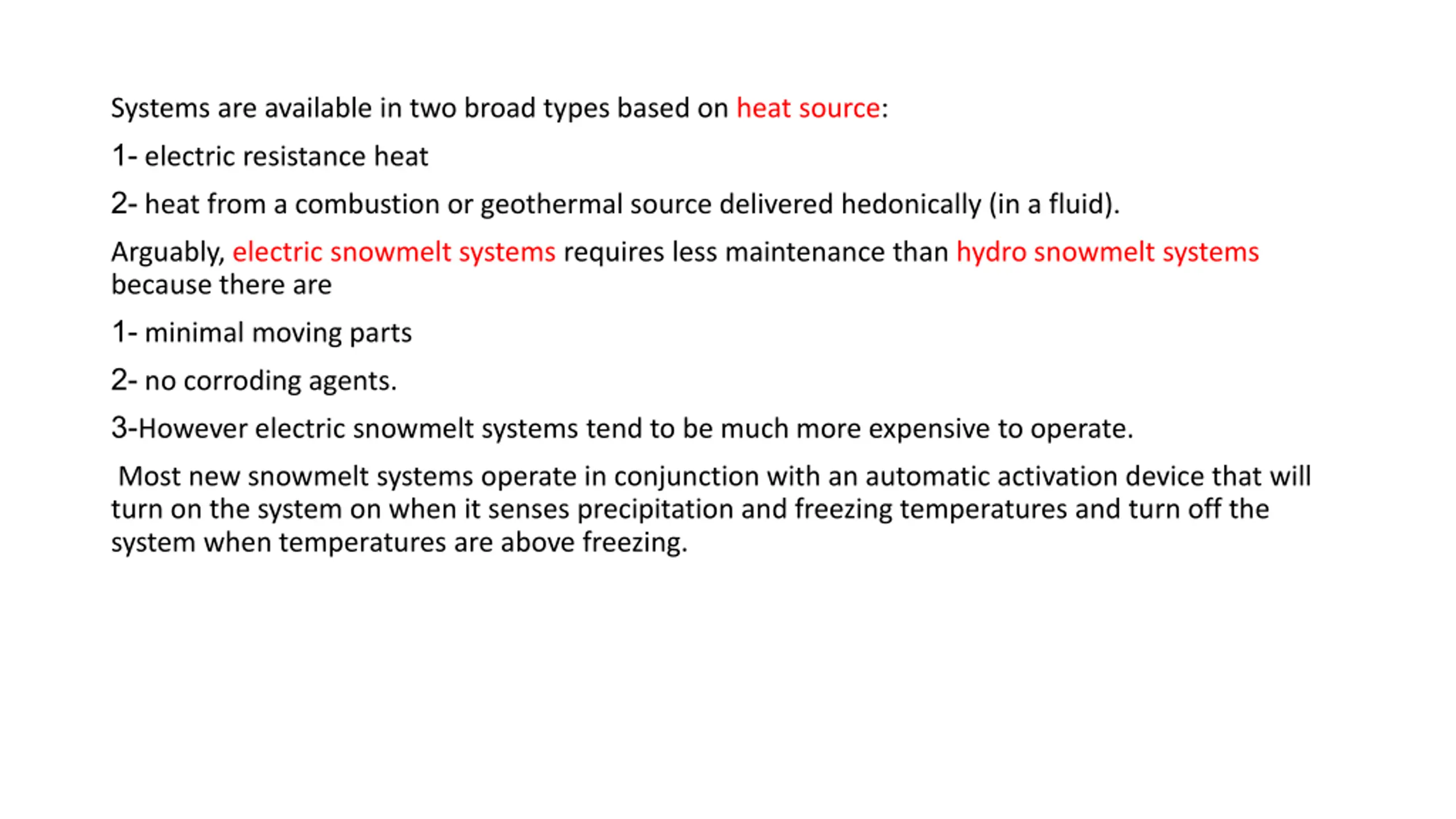 Systems are available in two broad types based on heat source: - 1 electric resistance heat - 2 heat from a combustion or geothermal source delivered hedonically (in a fluid). Arguably, electric snowmelt systems requires less maintenance than hydro snowmelt systems because there are - 1 minimal moving parts - 2 no corroding agents. - 3 However electric snowmelt systems tend to be much more expensive to operate. Most new snowmelt systems operate in conjunction with an automatic activation device that will turn on the system on when it senses precipitation and freezing temperatures and turn off the system when temperatures are above freezing.