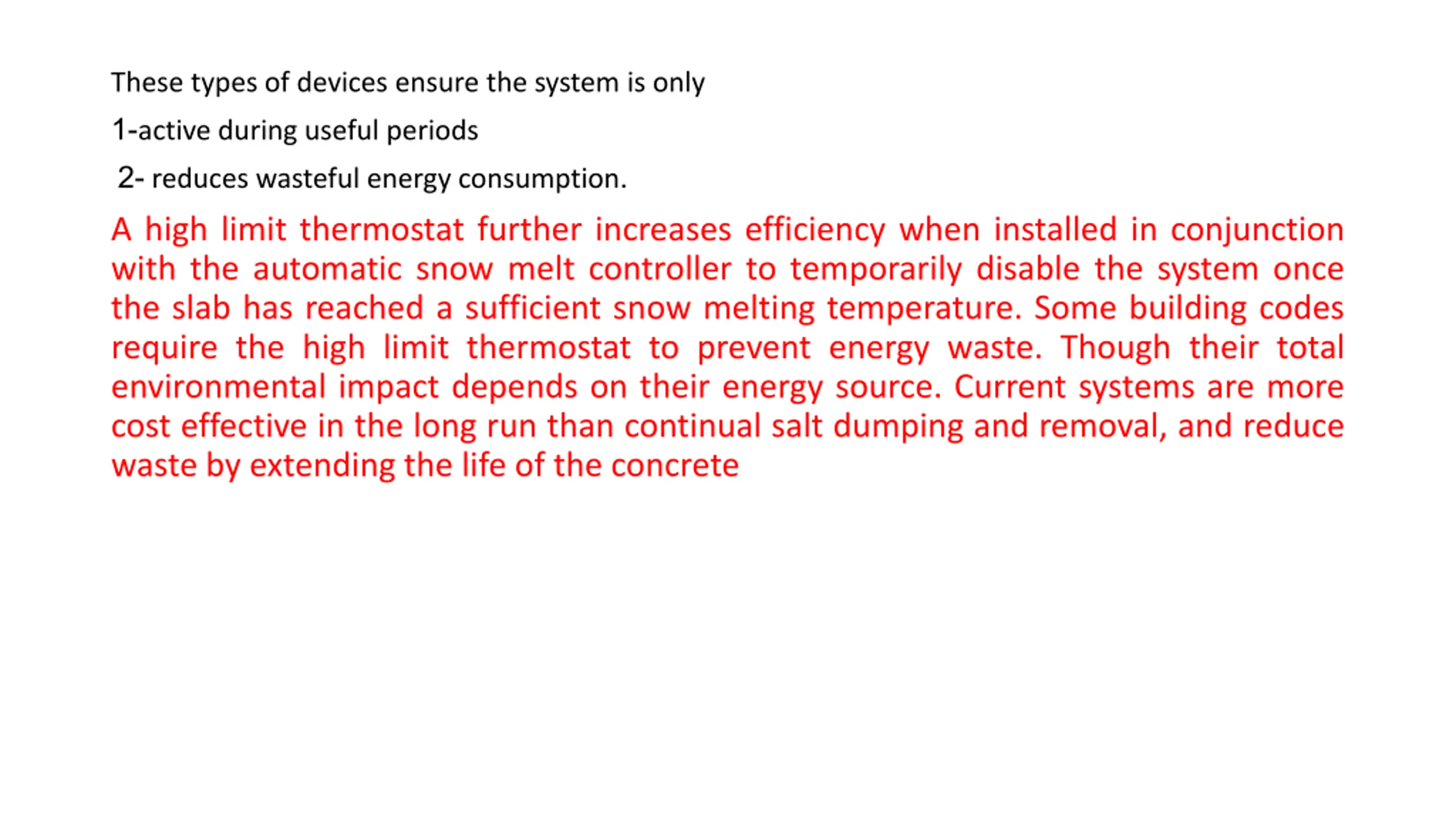These types of devices ensure the system is only - 1 active during useful periods - 2 reduces wasteful energy consumption. A high limit thermostat further increases efficiency when installed in conjunction with the automatic snow melt controller to temporarily disable the system once the slab has reached a sufficient snow melting temperature. Some building codes require the high limit thermostat to prevent energy waste. Though their total environmental impact depends on their energy source. Current systems are more cost effective in the long run than continual salt dumping and removal, and reduce waste by extending the life of the concrete