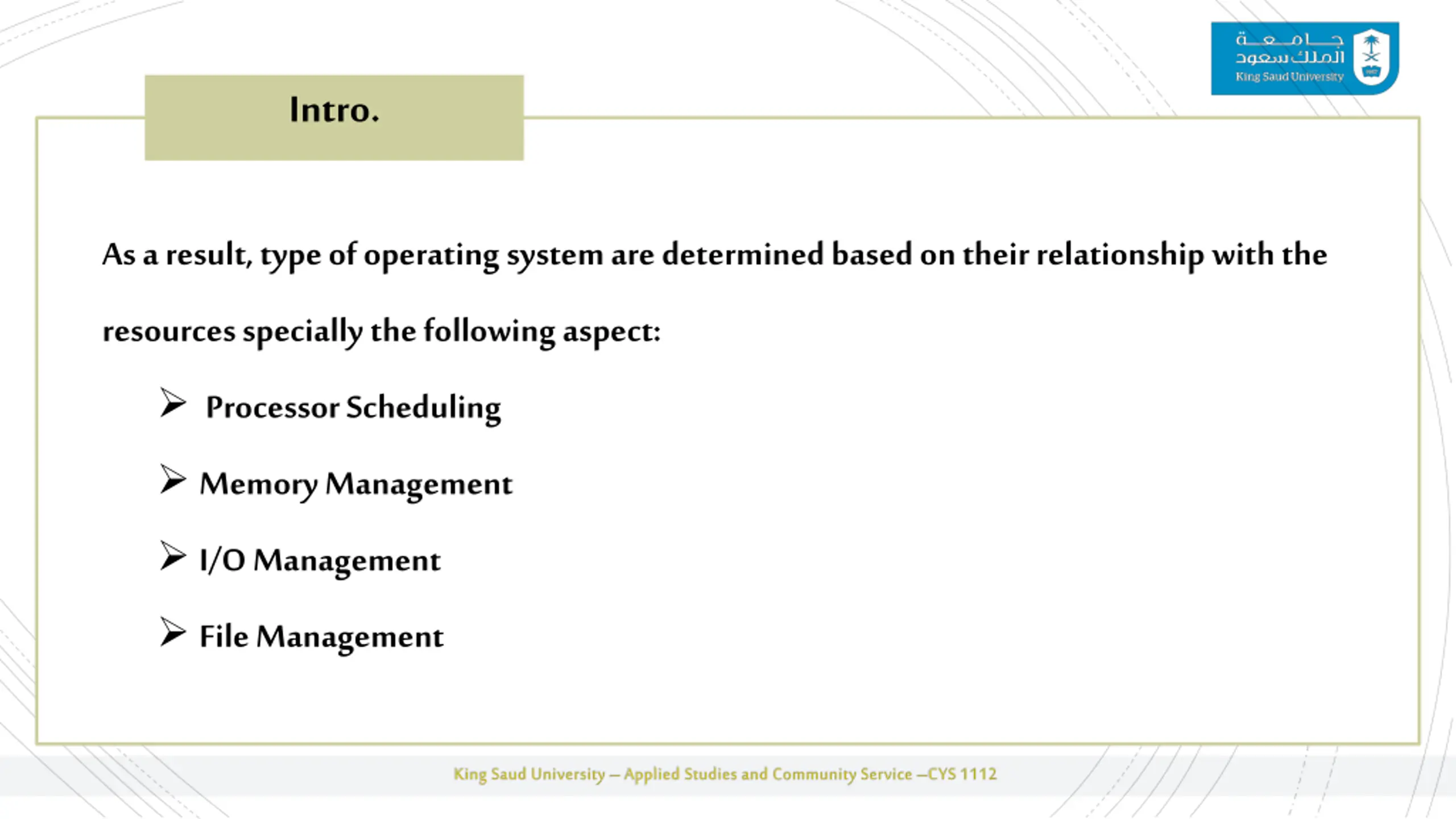 Intro. As a result, type of operating system are determined based on their relationship with the resources specially the following aspect: Processor Scheduling Memory Management I/O Management File Management King Saud University Applied Studies and Community Service CYS 1112
