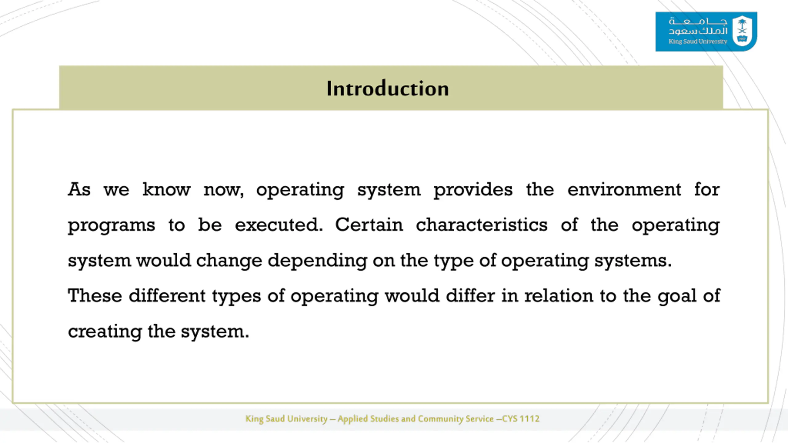 Introduction As we know now, operating system provides the environment for programs to be executed. Certain characteristics of the operating system would change depending on the type of operating systems. These different types of operating would differ in relation to the goal of creating the system. King Saud University Applied Studies and Community Service CYS 1112